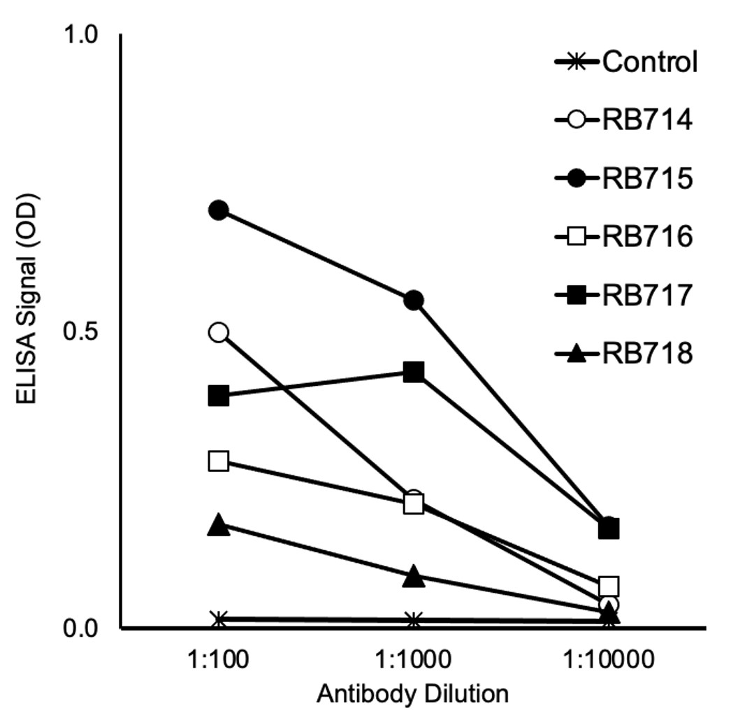 Antibodies RRB714, RRB715, RRB716, RRB717, RRB718 bound in a concentration-dependent manner to the GST-HMtA antigen, but not to the GST-fused peptide negative control (Fig. 1).