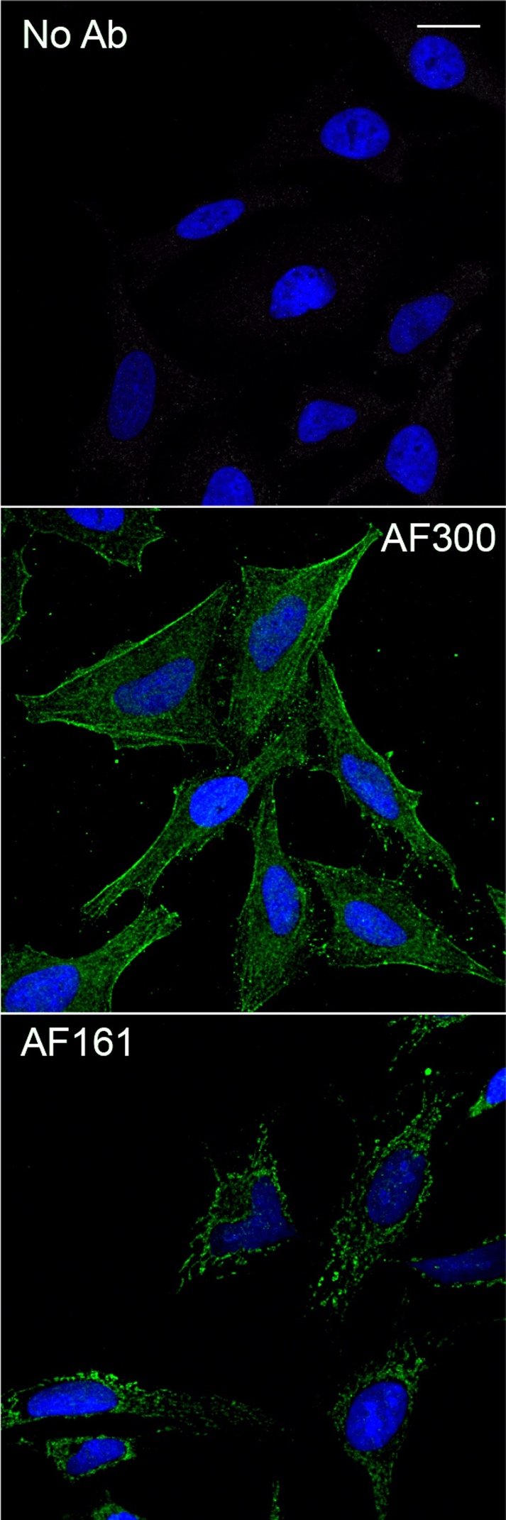 Figure 1. AF161 and AF300 antibodies successfully label the cytoskeletal filaments in HeLa cells (in green); in blue, nuclei are stained with DAPI. No labelling is seen when the primary antibody is omitted (No Ab panel). Scale bar: 20 µm.