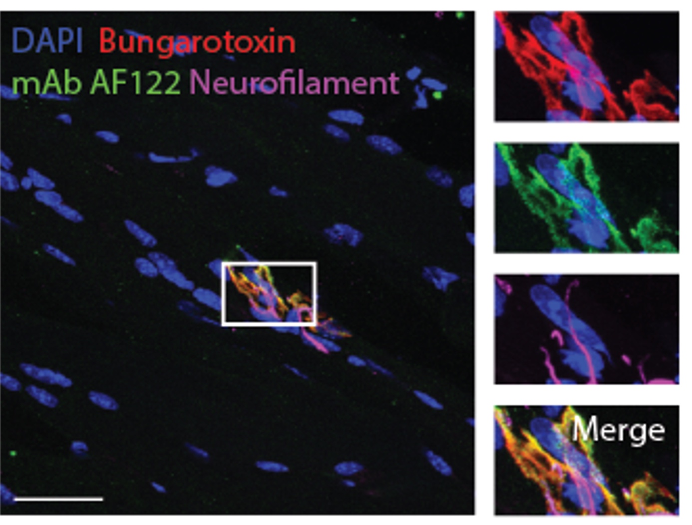 Figure 1. The AF122 antibody recognizes the AChR in the murine tibialis anterior muscle. Muscle endplates are identified by neurofilament staining and AChRs are visualized by binding of bungarotoxin. AF122 in green, bungarotoxin in red, neurofilament in purple and DAPI in blue. Scale bar: 20 mm.