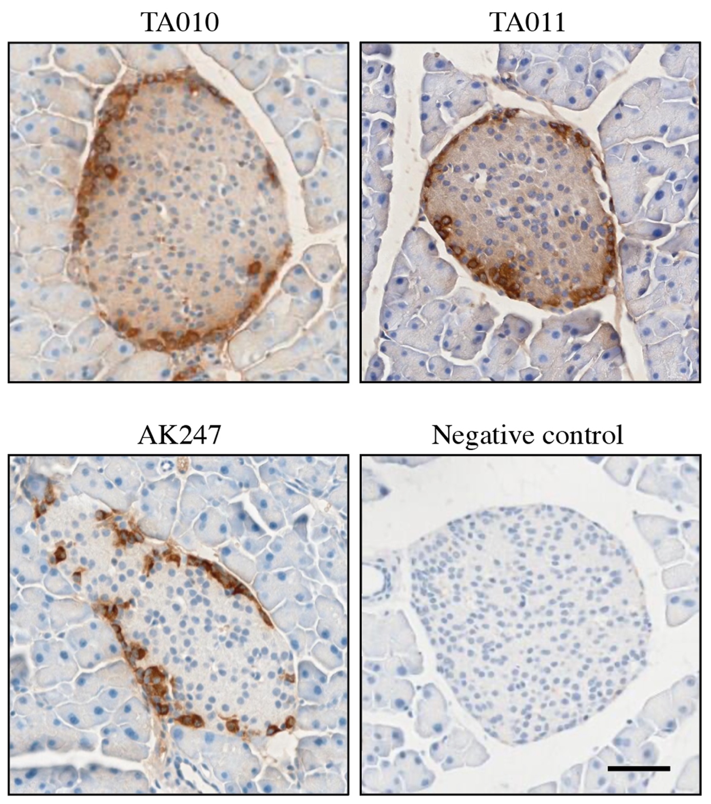 Figure 1. TA010 and TA011 antibodies bind specifically to pancreatic glucagon-secreting alpha cells, as detected by immunohistochemistry. The observed signal is similar to the signal obtained with the previously characterized AK247 antibody, with a higher level of background signal. No staining was observed when the primary antibody was omitted (negative control). Scale bar: 50 µm.