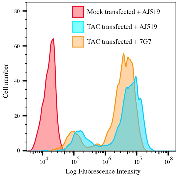 Both the IgG produced by the mouse hybridoma 7G7 and the reformatted scFv AJ519 detect the TAC protein at the cell surface of HEK293 transfected cells. No signal was detected in mock transfected cells (Fig. 1).