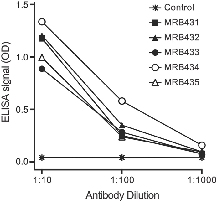 Figure 1. Specific binding of MRB antibodies to the target RapA peptide, as detected by ELISA. ‘Control’ indicates the binding of MRB431 to the negative control peptide (all other control curves were superimposed).