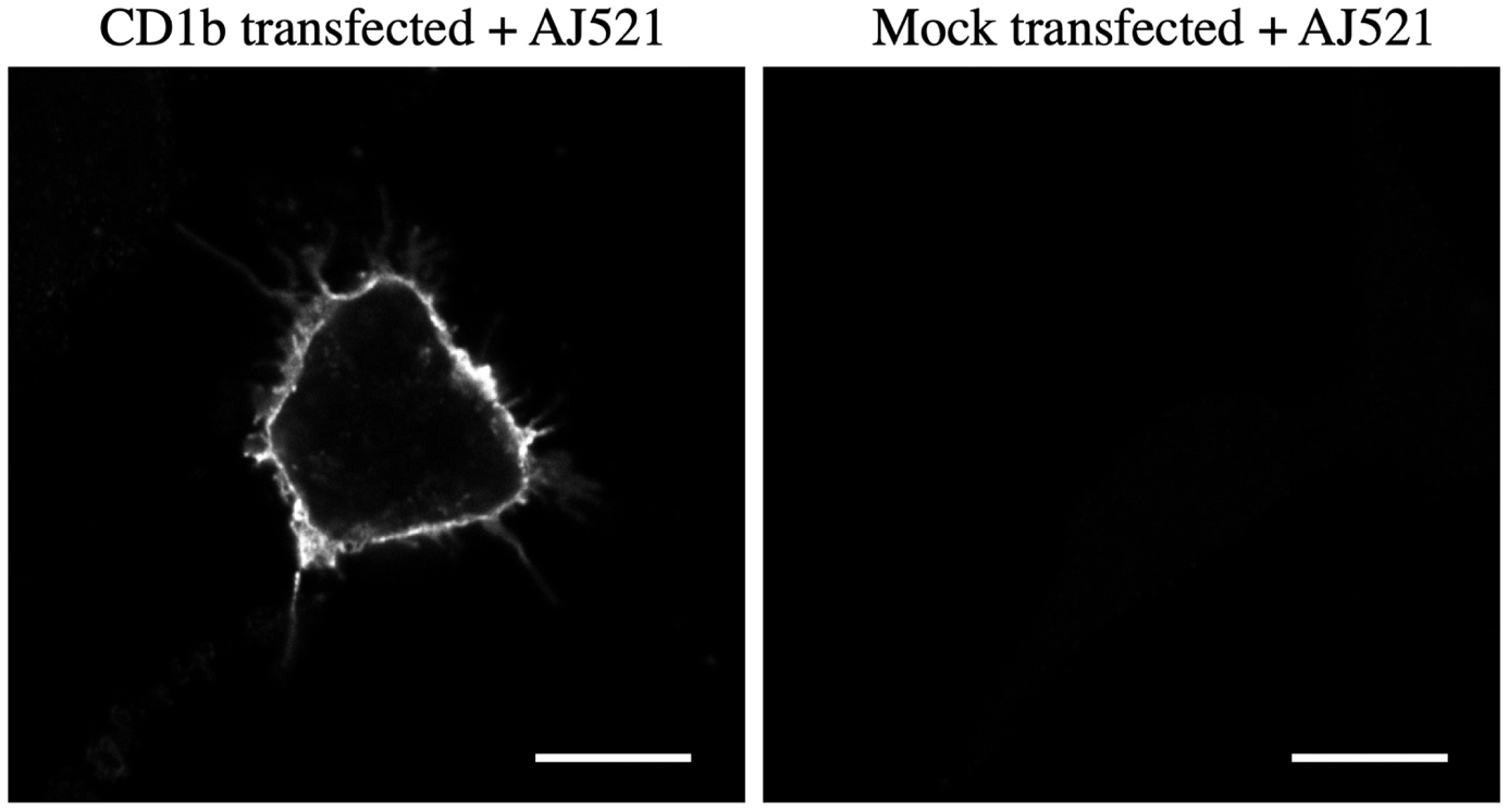 Figure 1. The AJ521 antibody labels the CD1b cell surface protein in CD1b-transfected cells. No staining was observed in mock transfected cells. Scale bar: 5 µm.