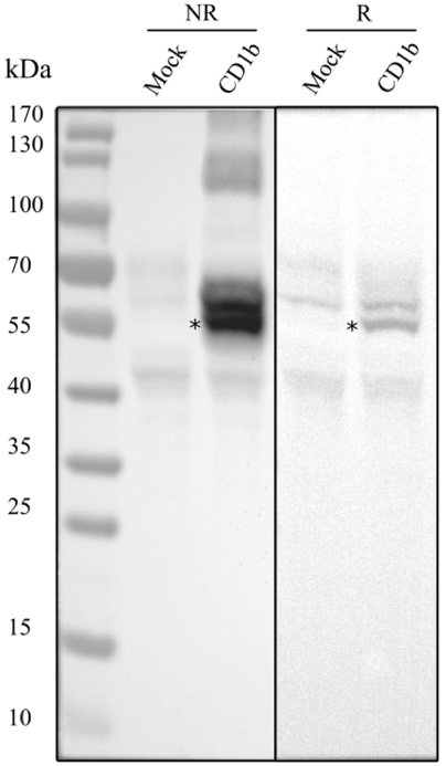 Figure 1. Specific binding of the AJ521 antibody to CD1b protein (position indicated by an asterisk) in CD1b-transfected cells in both non-reducing (NR) and reducing (R) conditions.