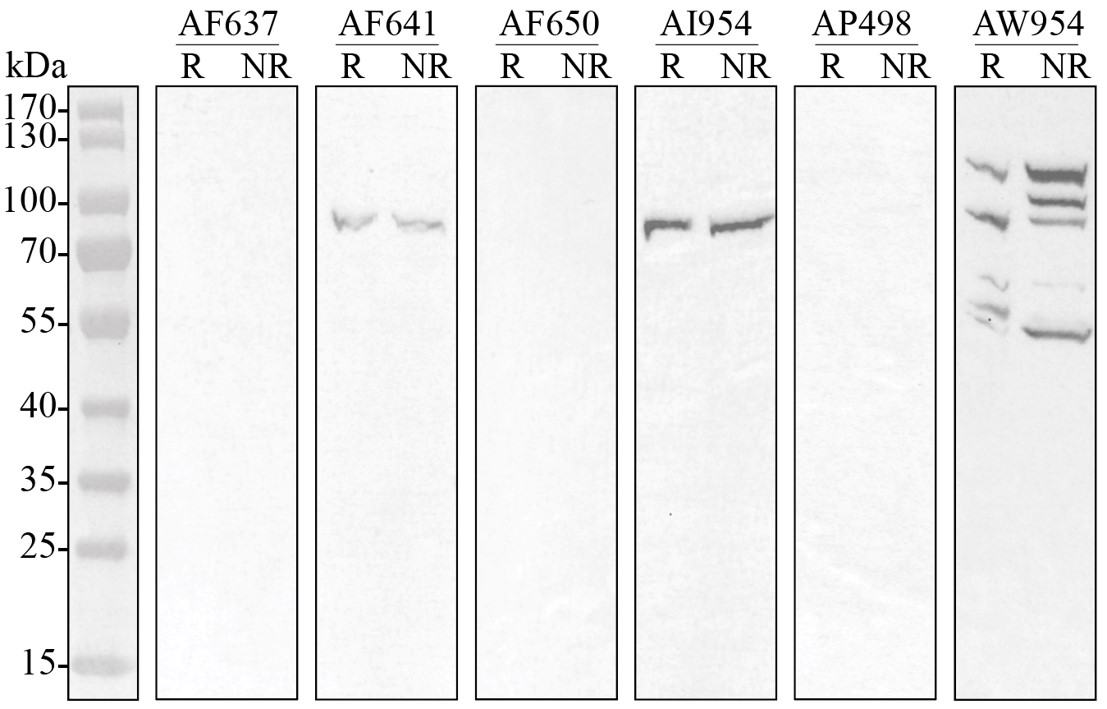 Figure 1. AF641, AI954 and AW954 specifically label markers of endoplasmic reticulum in HEK293 cells in both reducing (R) and non-reducing (NR) conditions. No signal was observed with AF637, AF650 and AP498 antibodies.