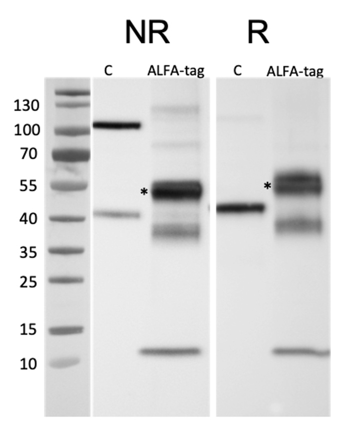 Figure 1. Specific binding of the AL626 antibody to the ALFA-tagged TAC protein (positions indicated by asterisks) (predicted molecular mass: ~55kD in reducing conditions). No difference was observed between non-reducing (NR) and reducing (R) condition.