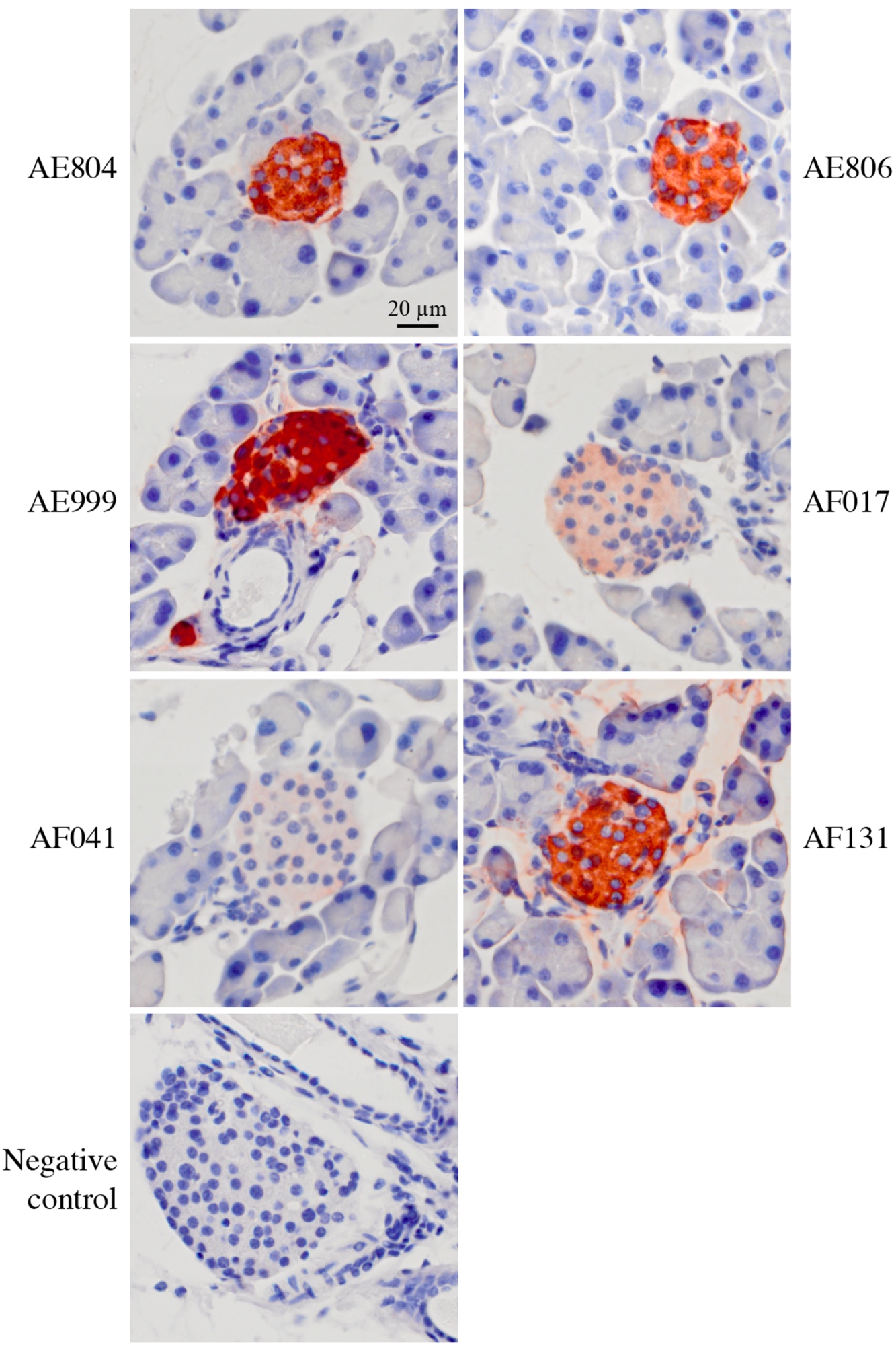 Figure 1. AE804, AE806, AE999, AF017, AF041 and AF131 antibodies bind specifically to pancreatic insulin-secreting beta cells, as detected by immunohistochemistry. No staining was observed when the primary antibody was omitted (negative control). Scale bar: 20 µm.