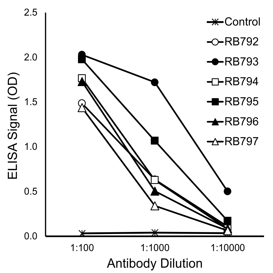 Antibodies RB792, RB793, RB794, RB795, RB796 and RB797 bound in a concentration-dependent manner to the phosphorylated NDC80 peptide against which they were raised, but not to the non-phosphorylated control peptide (Fig. 1). Although these antibodies recognized specifically the S44 phosphorylated NDC80 peptide by ELISA, their ability to bind the full-length protein should be determined in future experiments.