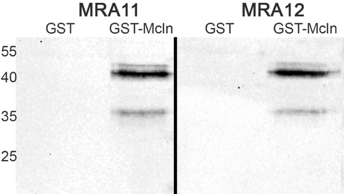 MRA11 and MRA12 antibodies specifically recognize the GST-Mcln fusion protein (~43 kDa), as well as a probable partial degradation product at ~35kDa. The antibodies do not bind the GST negative control (Fig. 1).
