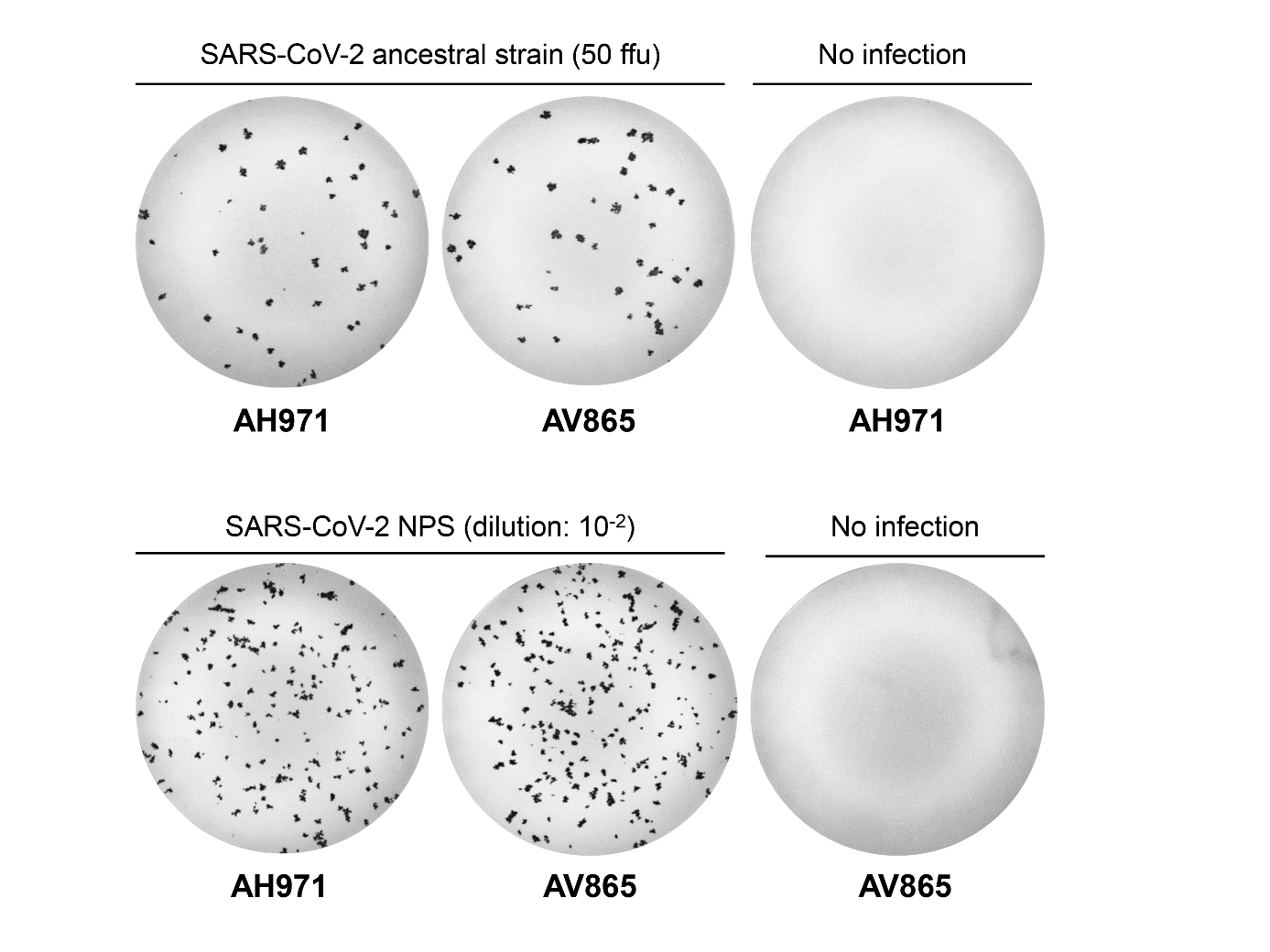 Figure 1. AH971 and AV865 antibodies successfully labelled virus foci in Vero E6-TMPRSS cells infected with 50 ffu of ancestral SARS-CoV-2 or NPS of SARS-CoV-2 (dilution 10-2 is shown). No labelling was seen in uninfected cells.