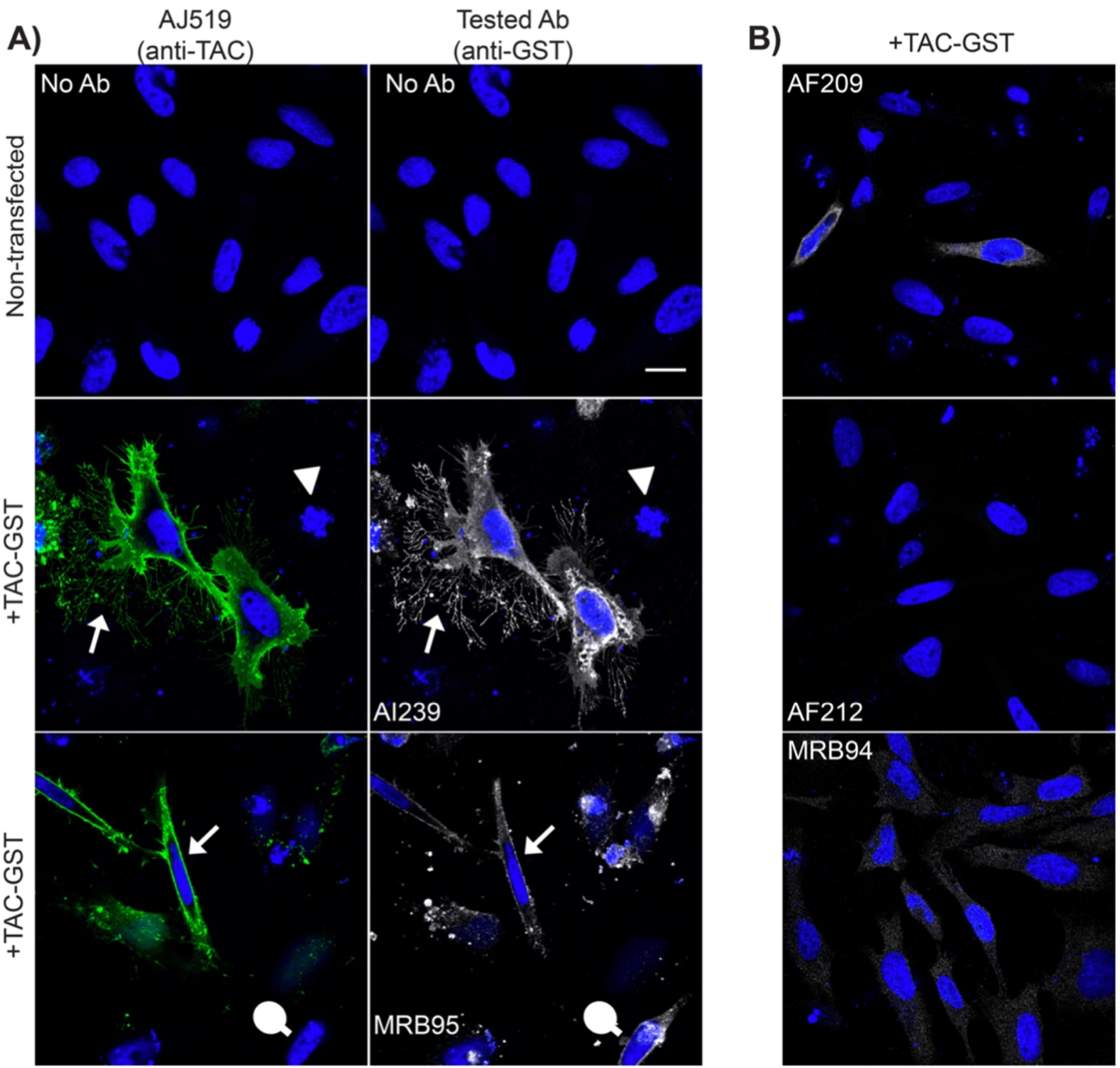Figure 1. (A) AI239 and MRB95 labeled the plasma membrane of HeLa cells expressing the GST-tagged TAC protein (in white); the signal co-localized (arrows) with the signal generated by the anti-TAC AJ519 antibody (in green); in blue, nuclei were stained with DAPI. MRB95 also labeled some cells not stained by AJ519 (pinheads). No labelling was seen when the primary antibody was omitted, or in non-transfected cells (arrowheads). (B) No labelling was seen for AF212 and MRB95; a faint labelling was seen for AF209, but not at the expected location. Scale bar: 20 μm.