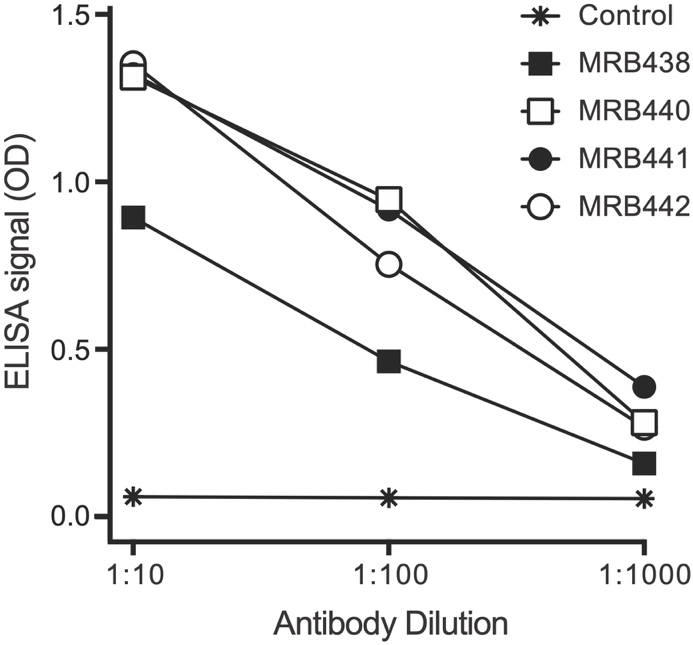Figure 1. Specific binding of MRB antibodies to the target Nup133 peptide, as detected by ELISA. ‘Control’ indicates the binding of MRB438 to the negative control peptide (all other control curves were superimposed).