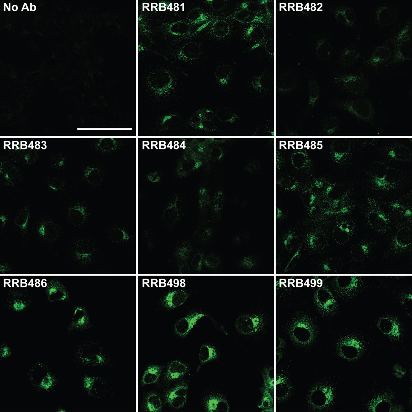The antibodies RRB481, RRB482, RRB483, RRB484, RRB485, RRB486, RRB498 and RRB499 label vesicular structures in a juxta-nuclear region, a staining typical of COPI peri-Golgi structures (Fig. 1). No signal was detected when the primary antibody was omitted (Fig. 1). Although the staining observed is what would be expected if these antibodies recognize COPI, it will be necessary to ascertain the specificity of this immunofluorescence signal by staining cells where COPI is depleted.