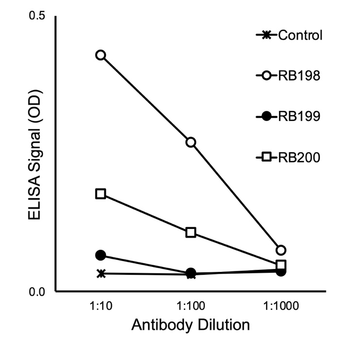 Figure 1. Specific binding of RB antibodies to the target GST-ORF3 protein, as detected by ELISA. ‘Control’ indicates the binding of RB198 to GST (all the other background curves are superimposed).