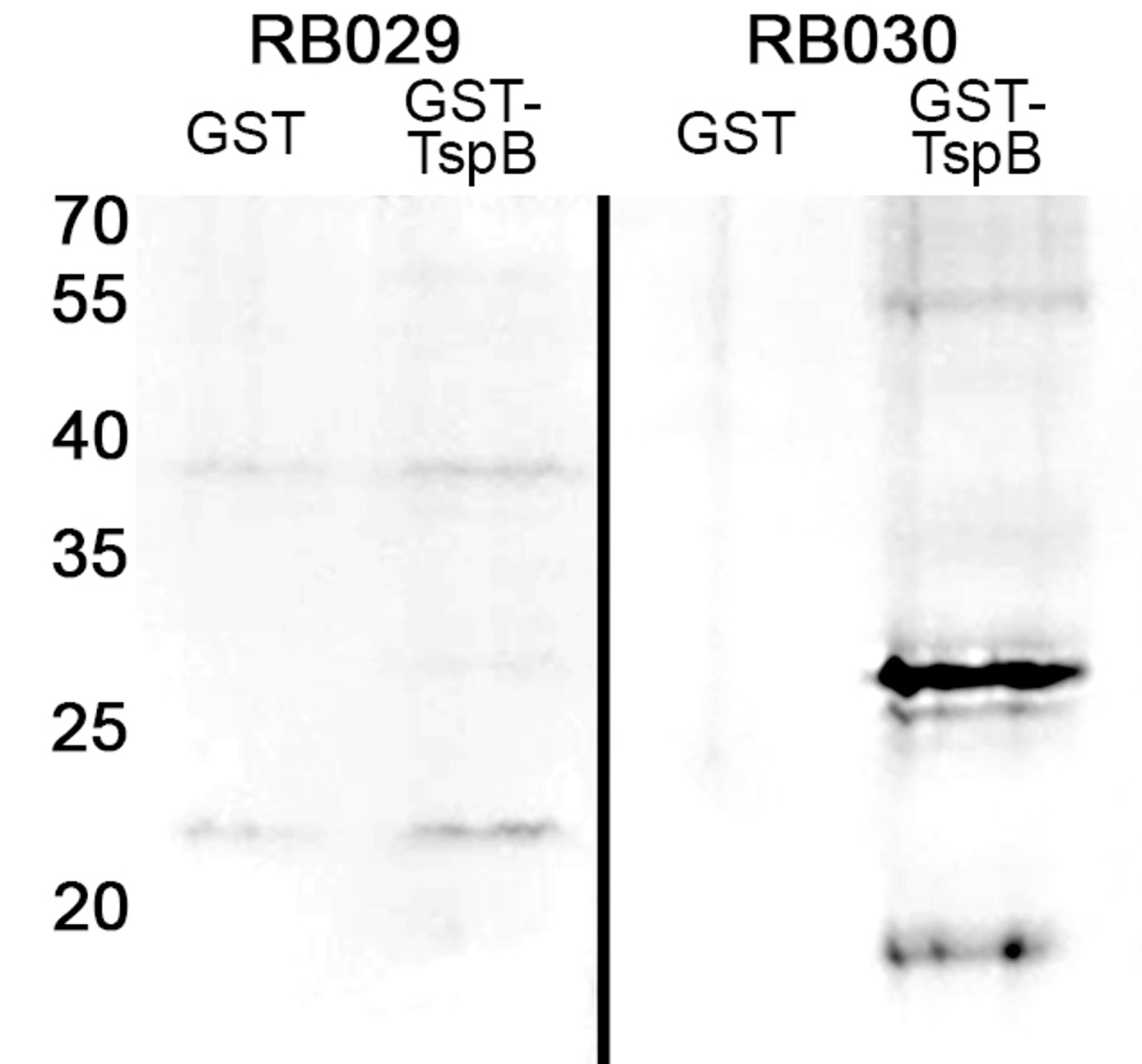 The RB030 antibody specifically recognizes the GST-TspB fusion protein (~30 kDa), as well as a probable partial degradation product at ~18 kDa; it does not bind the GST negative control (Fig. 1). RB029 does not recognize GST-TspB (Fig. 1). Note that the antigen used here encompasses a fragment of an extracellular domain of the TspB protein, and it is presumably not properly folded. It may also lack proper post-translational modifications. Further experiments will be necessary to determine if and in which experimental conditions RB030 recognizes the full-length TspB protein.