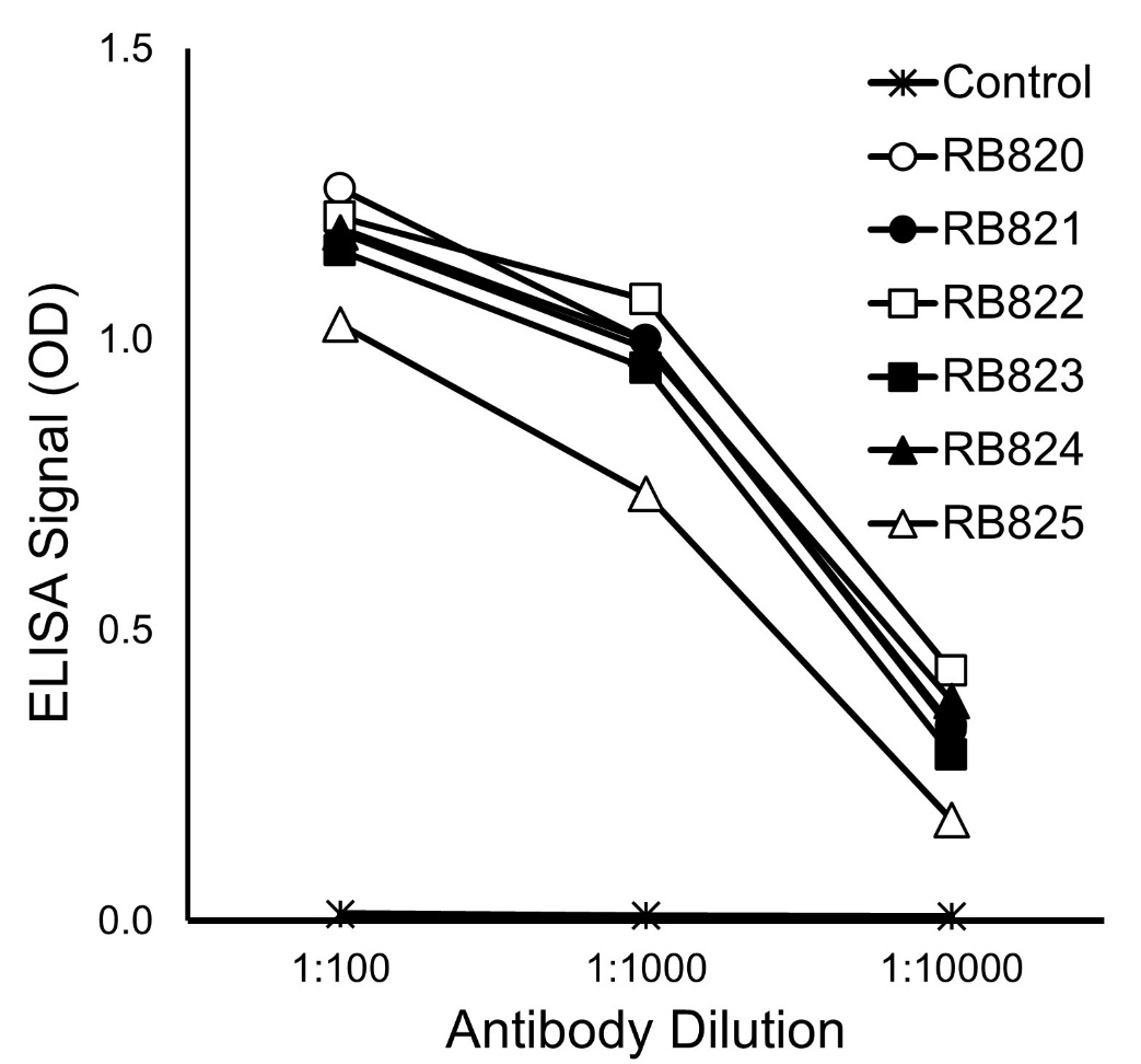 Figure 1. Specific binding of RB antibodies to the TST tagged mNeonGreen protein but not to an irrelevant TST tagged peptide (shown only for RB820; other background curves are superimposed), as detected by ELISA.