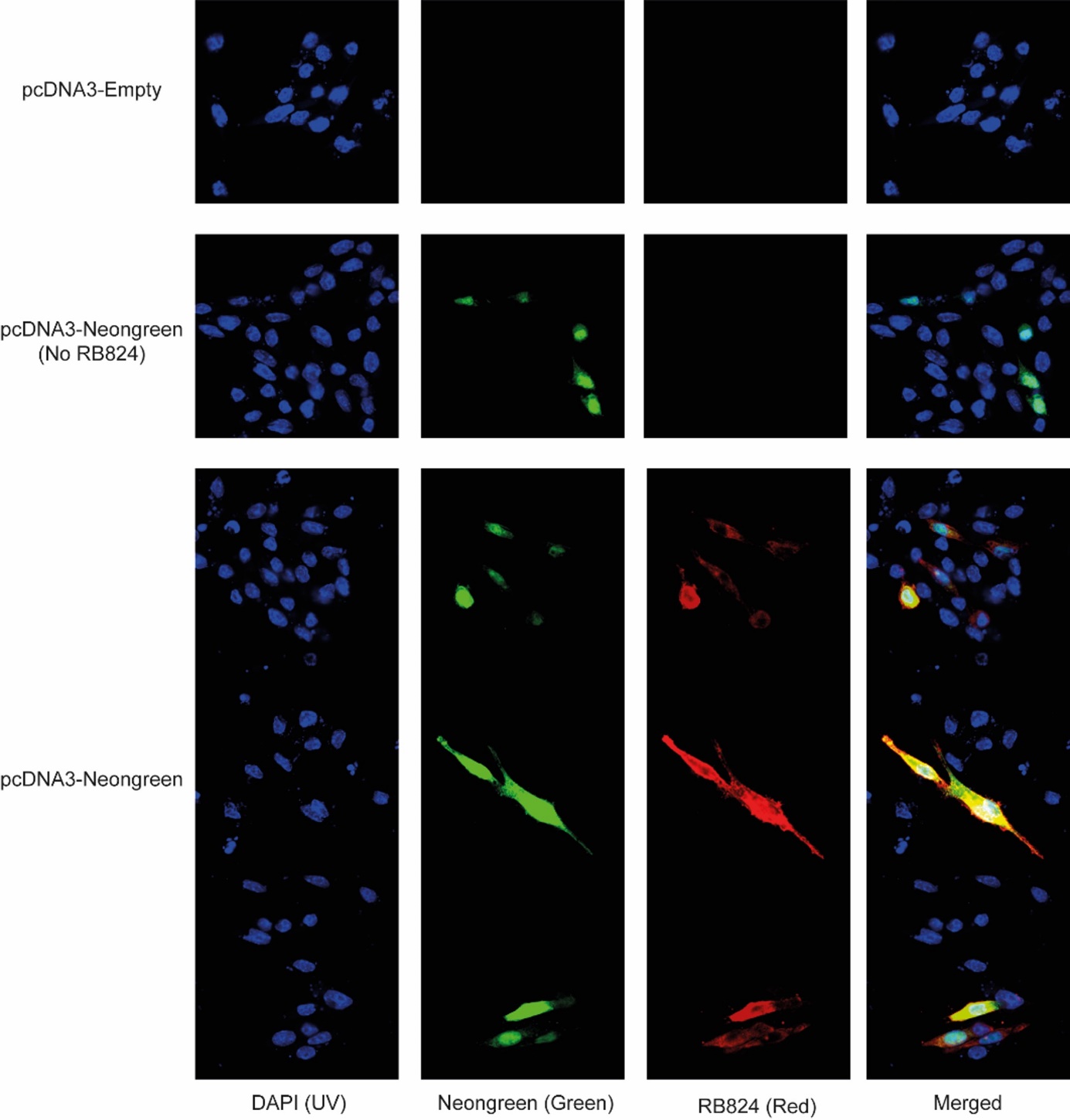 Figure 2. Specific binding of the RB824 antibody to mNeonGreen in RAW 264.7 cells, as detected by immunofluorescence. Living cells transfected with pcDNA-mNeonGreen exhibited green fluorescence, contrasting with their pcDNA-Empty transfected counterparts. RB824 antibodies (labelled in red) detected the presence of mNeonGreen by immunofluorescence. Merged analysis confirmed the colocalization of green and red fluorescence in transfected cells.