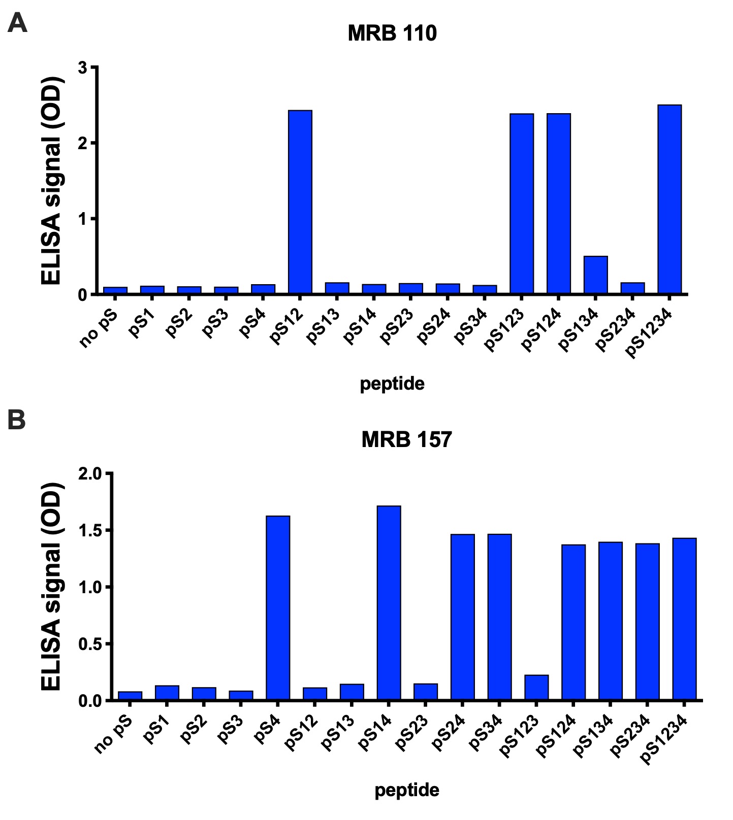 Figure 1. ELISA binding signals for MRB antibodies to a panel of CCR5(325-352) phosphopeptides. pS1, pS12, etc. indicate the sites in the peptide at which phosphoserine was incorporated: pS1=pS336, pS2=pS337, pS3=pS342, pS4=pS349. A) MRB110. B) MRB157.