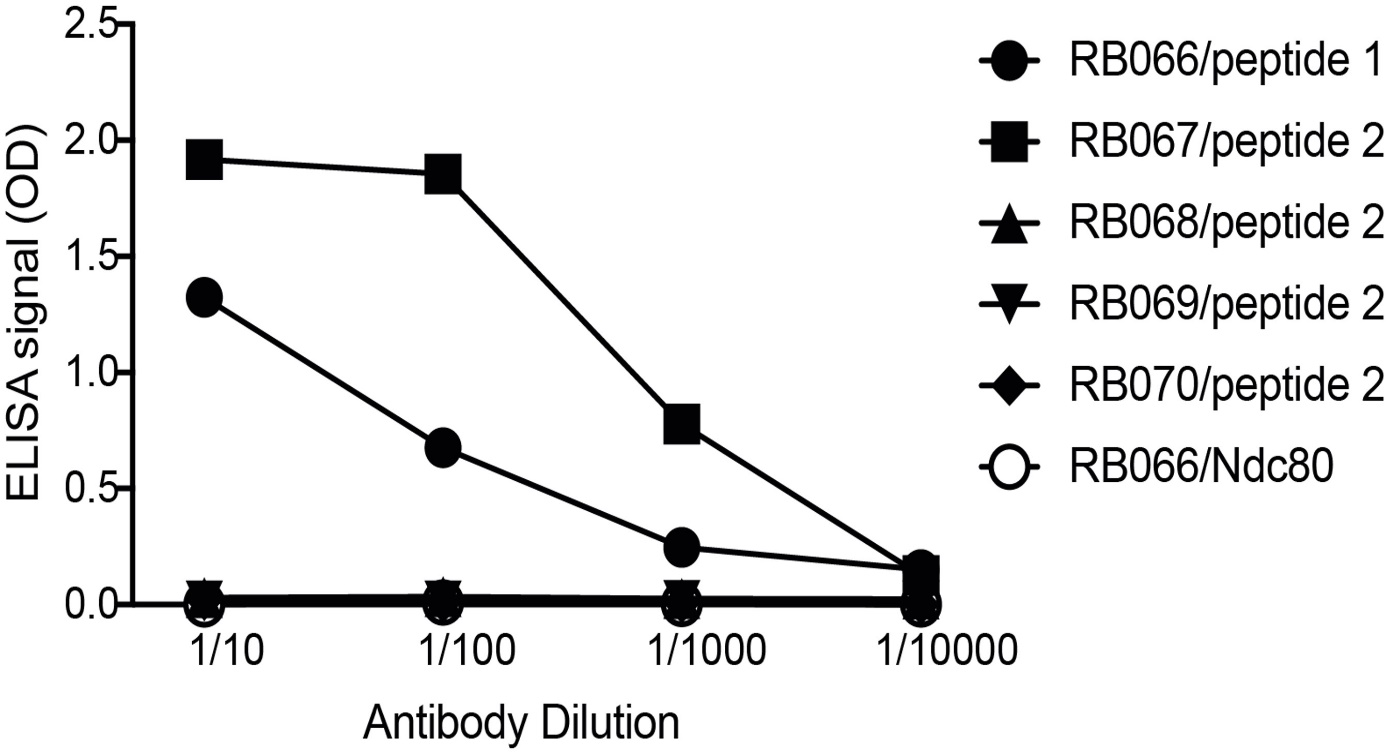 Fig. 1. RB066 and RB067 bound to CDNK2A peptide 1 and peptide 2, respectively, but not to the negative control peptide NDC80 (shown only for RB066; the other background curves were superimposed). RB068, RB069 and RB070 did not bind to CDKN2A peptide 2.
