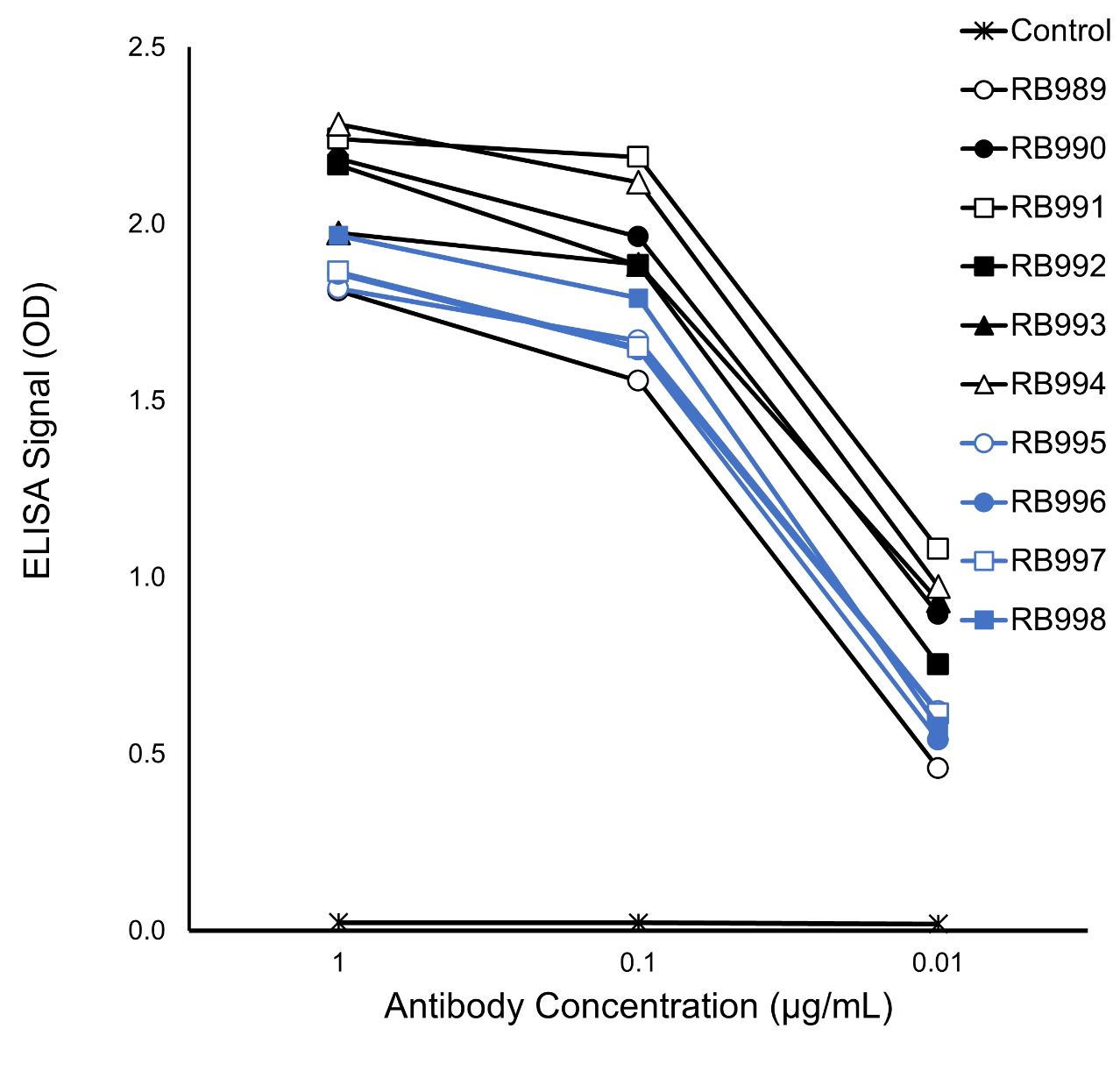 Figure 1. Specific binding of RB antibodies to the target GAA-TST protein, but not to the negative control (shown only for RB989; other background curves are superimposed), as detected by ELISA.