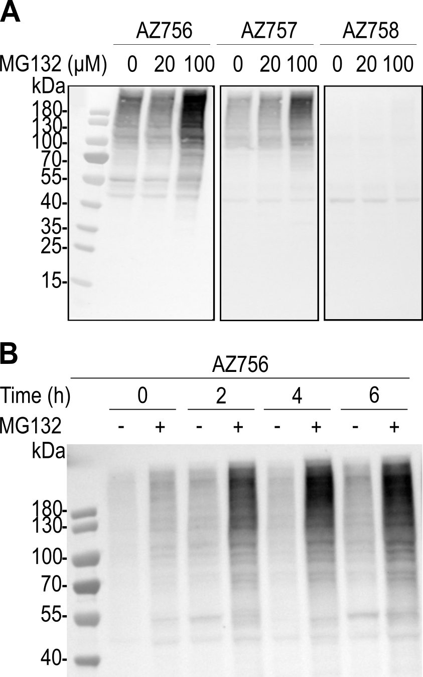 Fig. 1. (A) Specific binding of AZ756 and AZ757 to D. discoideum ubiquitinated proteins, as detected by western blot. No detection was observed with the antibody AZ758. Wild-type cells were treated with increasing concentrations of the proteasome inhibitor MG132 for 18 hours. (B) Western blot showing the kinetics of ubiquitinated protein accumulation using AZ756 antibody. Wild-type cells were treated with 100 μM MG132 and were collected at different time points.