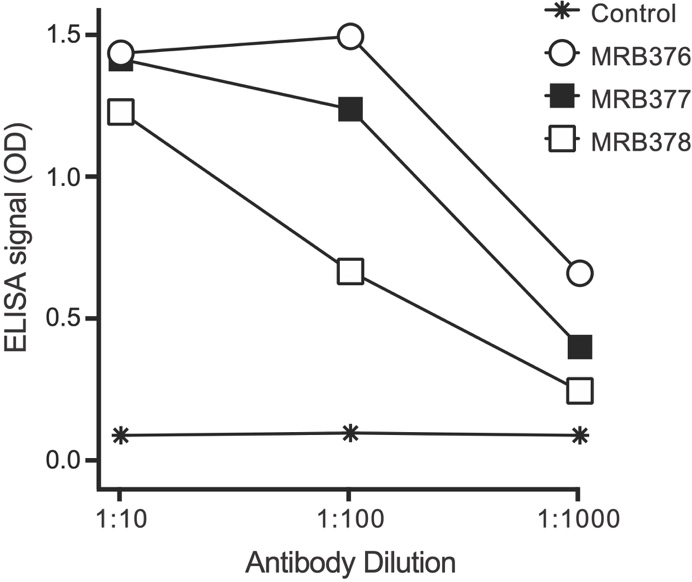 Figure 1. Specific binding of MRB antibodies to the target AlyA peptide, as detected by ELISA. ‘Control’ indicates the binding of MBR376 to the negative control peptide (all other control curves were superimposed).