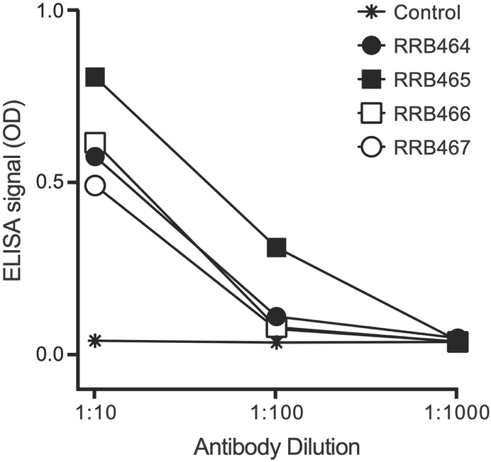 Figure 1. Specific binding of RRB antibodies to the target AlyA peptide, as detected by ELISA. ‘Control’ indicates the binding of RRB464 to the negative control peptide (all other control curves were superimposed).
