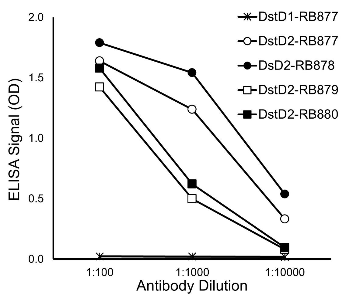 Figure 1. Specific binding of ABCD_RB antibodies to the target D. discoideum DstD2-derived peptide but not to the DstD1-derived peptide (shown only for ABCD_RB877; other background curves are superimposed), as detected by ELISA.