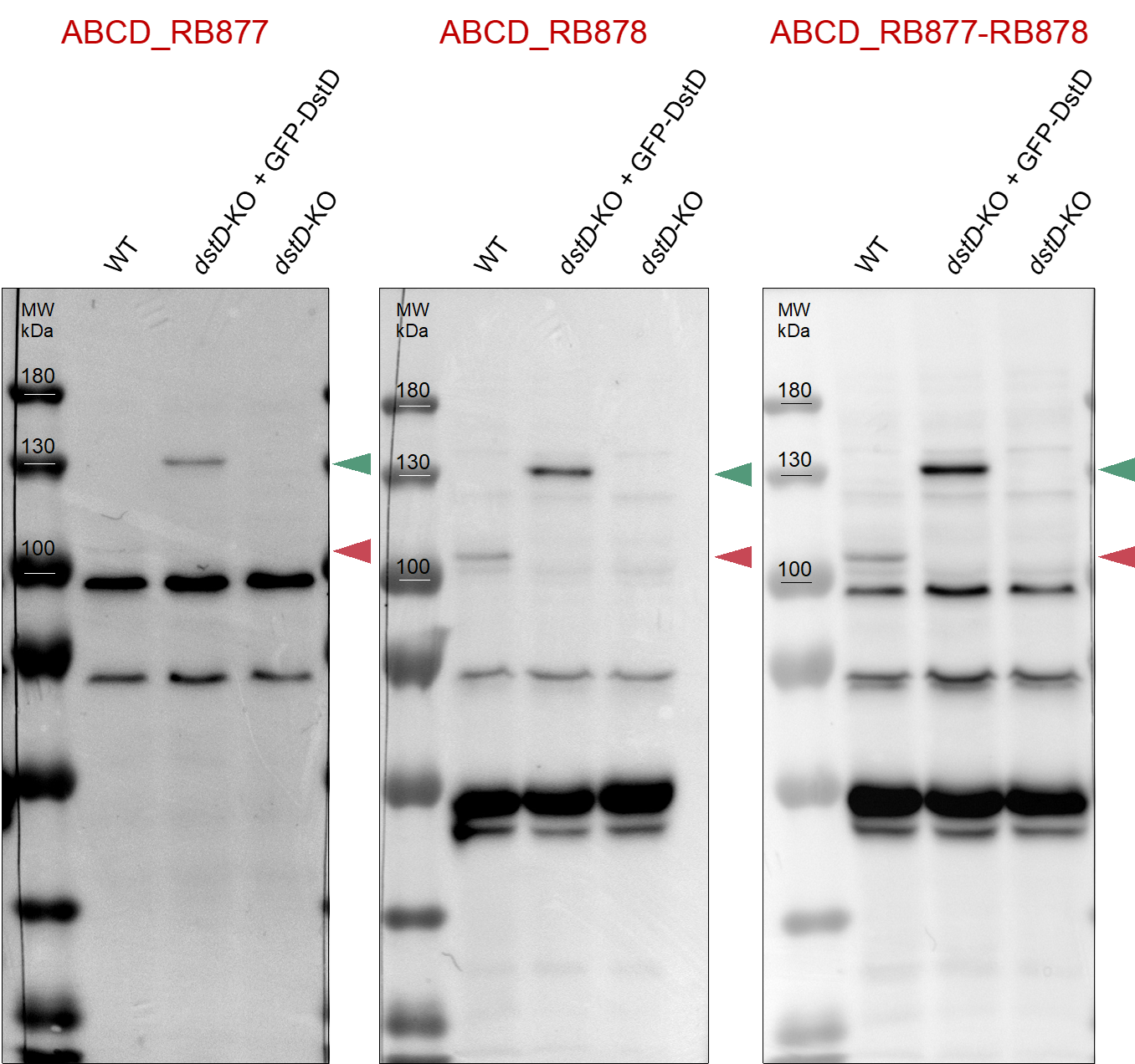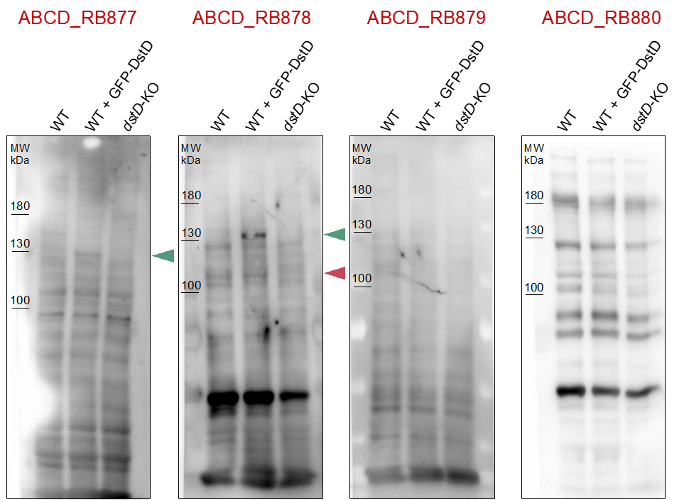 Figure 2. Western blot on lysates from wild type D. discoideum Ax2 (Ka) cells expressing GFP-DstD and dstD-KO cells. Membranes were blocked with 5% (w/v) BSA for 1h and incubated overnight with the indicated ABCD_RB antibodies at a dilution of 1:10. Endogenous DstD has an expected size of 93 kDa, and GFP-DstD of 120 kDa. Green arrows indicate the GFP-DstD protein and the red arrow the endogenous DstD protein.