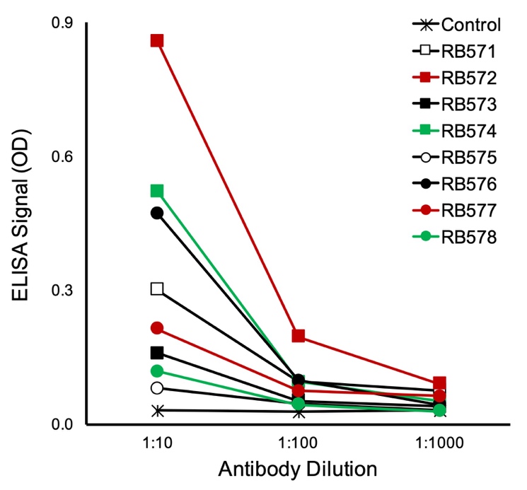 Figure 1. Specific binding of RB antibodies to the target M peptide (ratio signal:background >2), but not to the control peptide (shown only for RB574; all other background curves are superimposed), as detected by ELISA.