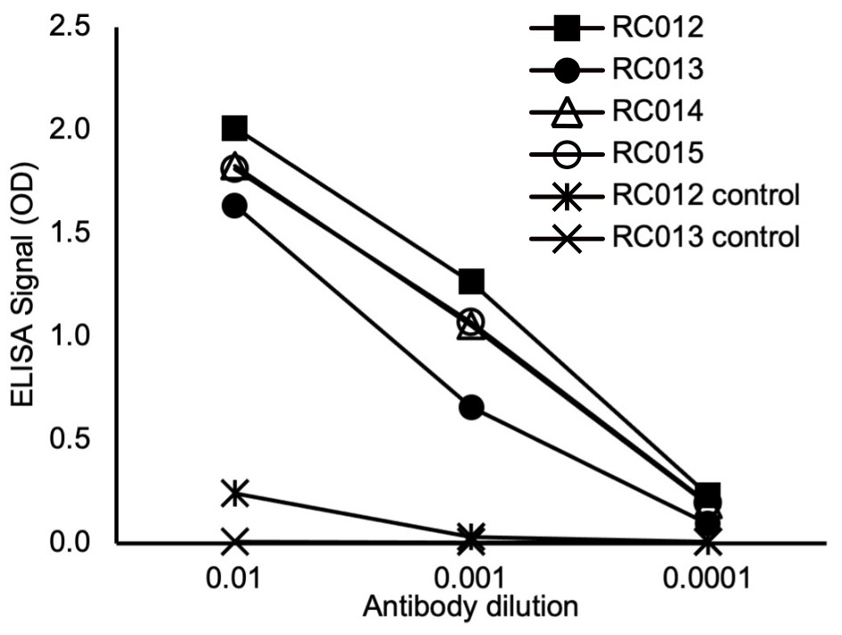 Figure 1. Specific binding of antibodies RC012 to RC015 to the target AplA-TST protein, but not to the negative control (no antigen; shown only for RC012 and RC013; background curves for the other antibodies are superimposed with the RC013 control), as detected by ELISA.