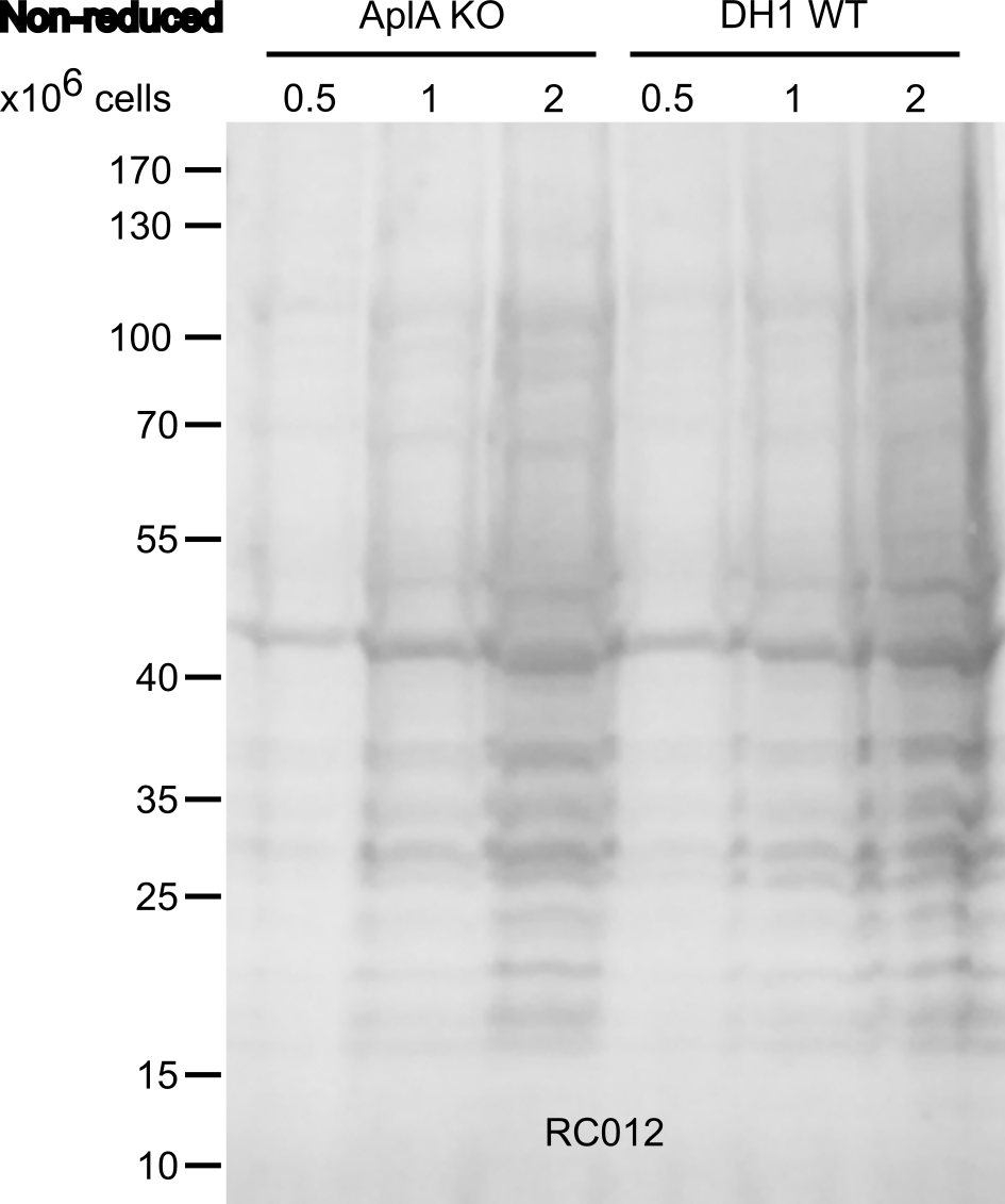 Finally, RC012 was tested for its ability to detect endogenous levels of AplA by western blot in DH1-10 wild-type cells. AplA KO cells were included as a negative control. Under these conditions, RC012 failed to detect endogenous AplA in wild-type cells (Fig. 3). This suggests that endogenous AplA is either expressed at levels below the detection limit of the antibody under the conditions tested, or that its native cellular context limits epitope accessibility. AplA belongs to the saposin family of proteins, which share conserved structural features and sequence similarities. Further analyses would be required to assess potential cross-reactivity of RC102 with other members of this protein family.