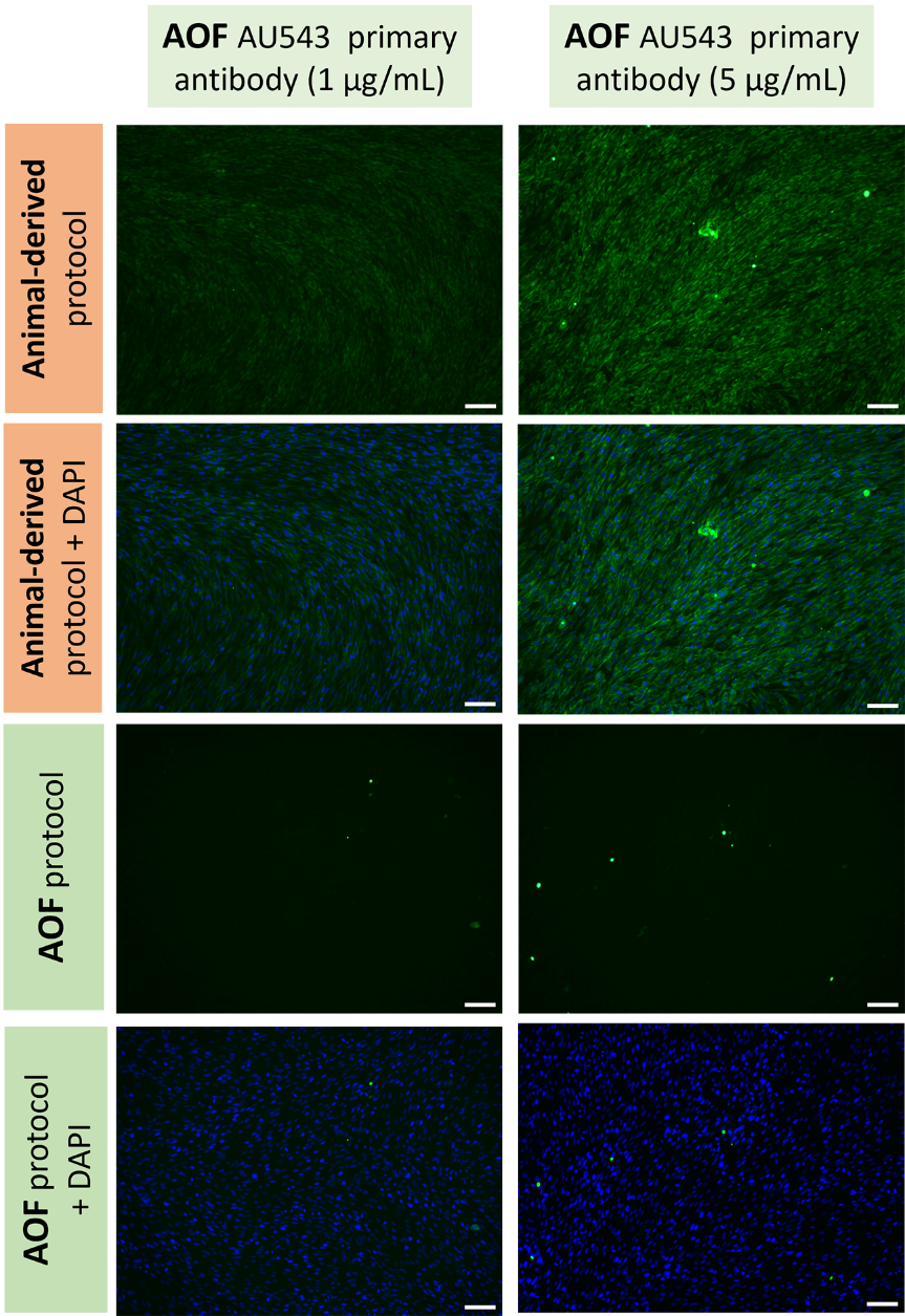 Fig. 1. Immunofluorescence. detection of cell-secreted collagen type II (green) in the extracellular matrix using the AOF primary antibody AU543. AU543 was tested at 1 and 5 µg mL⁻¹ using two staining protocols: an animal-derived blocking protocol (FBS/BSA) and an animal-origin-free (AOF) protocol based on AOF blocking solution. Each condition is shown with or without DAPI nuclear counterstaining (blue). Scale bar: 100 µm.