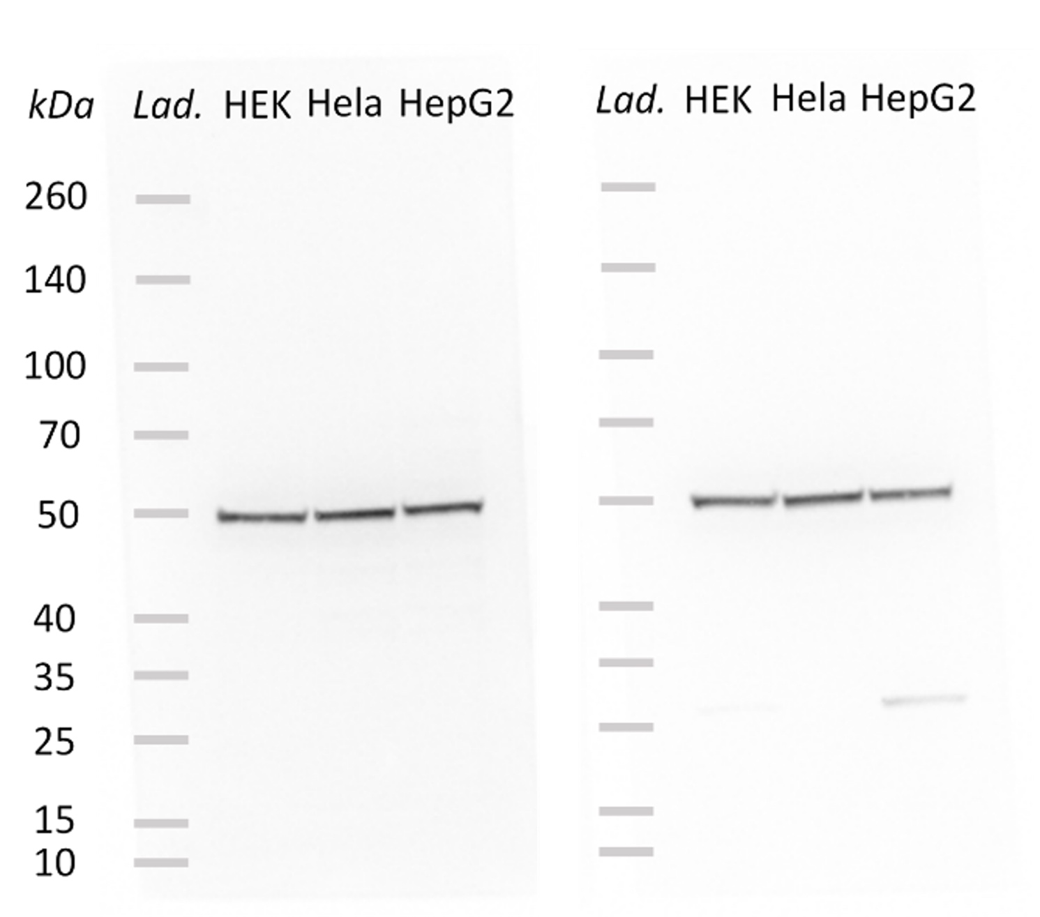 Figure 1. Specific detection of human α-tubulin by western blot (predicted molecular weight: 50 kDa in reducing conditions) in lysates of HEK293, HeLa, and HepG2 cells using antibodies AA345 (left) and control T5168 (right). Detection of chemiluminescence signal upon 30 s (AA345, left) or 10 s (T5168, right) of exposure.