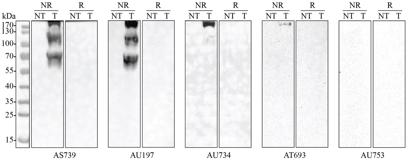 Figure 1. Specific binding of AS739, AU197, AU734 and AT693 antibodies to the SARS-CoV-2 S protein in Vero-B4 transfected (T) cells in non-reducing (NR) conditions, but not in reducing (R) conditions. No band was observed in non-transfected (NT) cells. AU753 did not recognize the S protein by western blot.