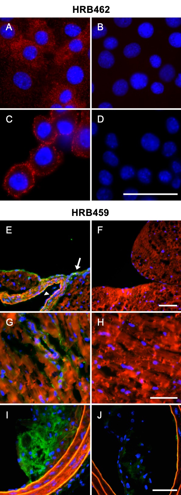 Figure 1. (A-D) HRB462 recognizes Panx1 (red) in MCECs (A) and RAW 264.7 (C) cell lines. No signal was detected when the first antibody was omitted (B and D). DAPI (blue). (E-J) HRB459 targets Panx1 (green) in the endothelium of coronary vessels, in cardiac microvasculature and in atherosclerotic lesions in carotid arteries (E, G, I, respectively). No labeling was observed in tissues extracted from Panx1-/- mice (F, H and J). DAPI (blue), Evans blue (red). Scale bars: 50 µm.