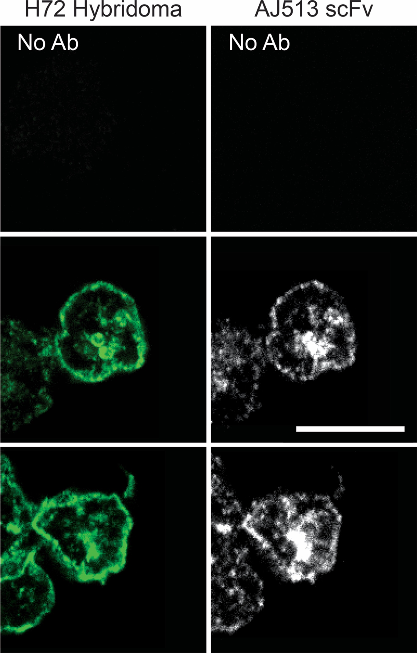 Antibodies: ABCD_AJ513 antibody (ABCD nomenclature, http://web.expasy.org/abcd/) was produced by the Geneva Antibody Facility (http://unige.ch/medecine/antibodies/) as mini-antibody with the antigen-binding scFv fused to a rabbit IgG Fc. The synthesized scFv sequence (GeneArt, Invitrogen) corresponds to the sequence of the variable regions joined by a peptide linker (GGGGS)3. The sequencing of the H72 hybridoma was performed by the Geneva Antibody Facility. HEK293 suspension cells (growing in FreeStyle™ 293 Expression Medium, Gibco #12338) were transiently transfected with the vector coding for the scFv-Fc. Supernatants (~50 mg/L) were collected after 5 days.