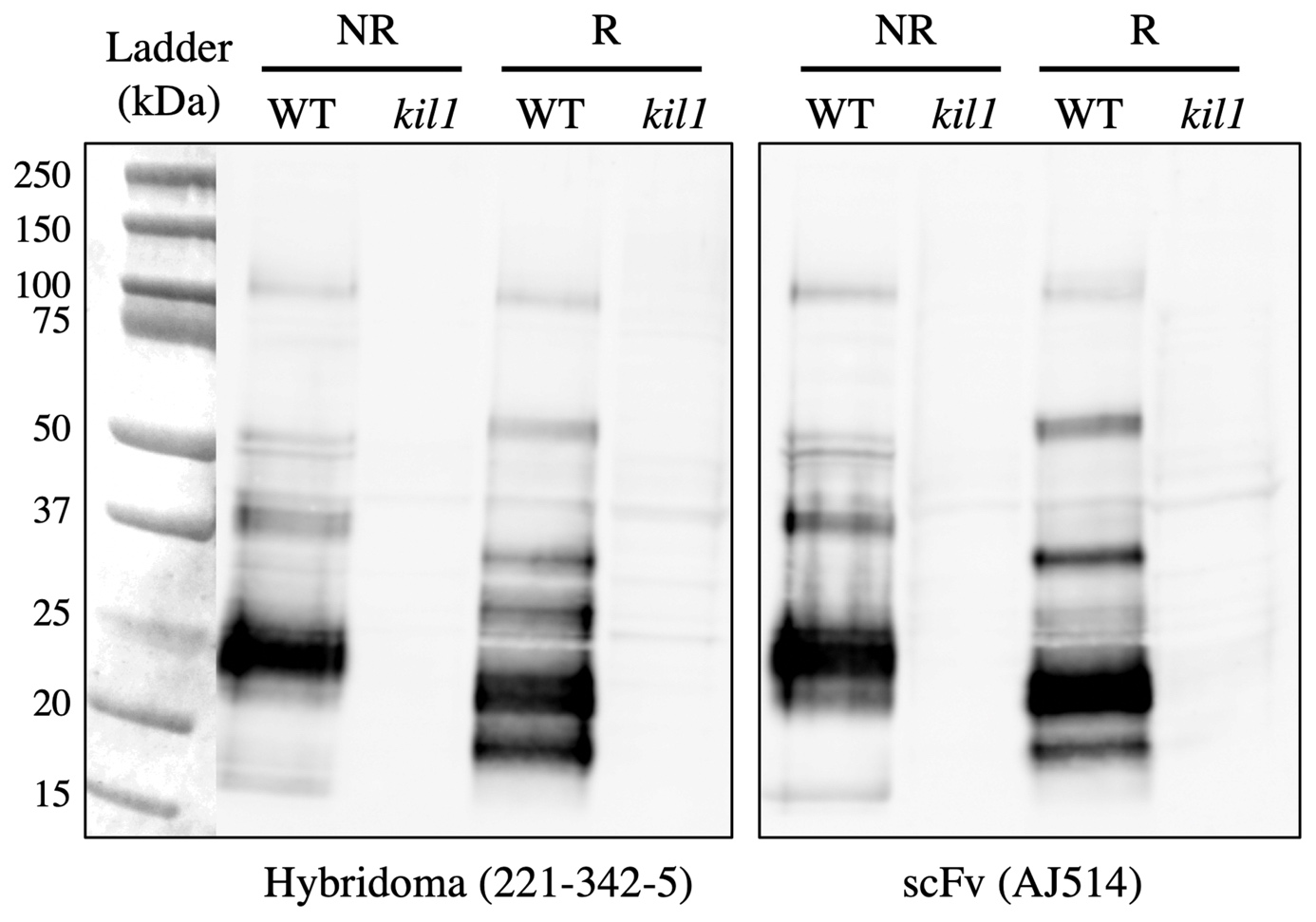 Figure 1. The 221-342-5 hybridoma and the AJ514 scFv antibodies recognize the common antigen 1 in Dictyostelium WT cells but not in the sulfation-defective kil1 KO cells (NR: non-reducing conditions; R: reducing conditions).