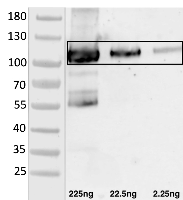 Figure 1. Specific binding of the AD946 antibody to 6xHis-tag fused to the MOG-Fc-Avi protein (predicted molecular mass: ~100kD in reducing conditions).