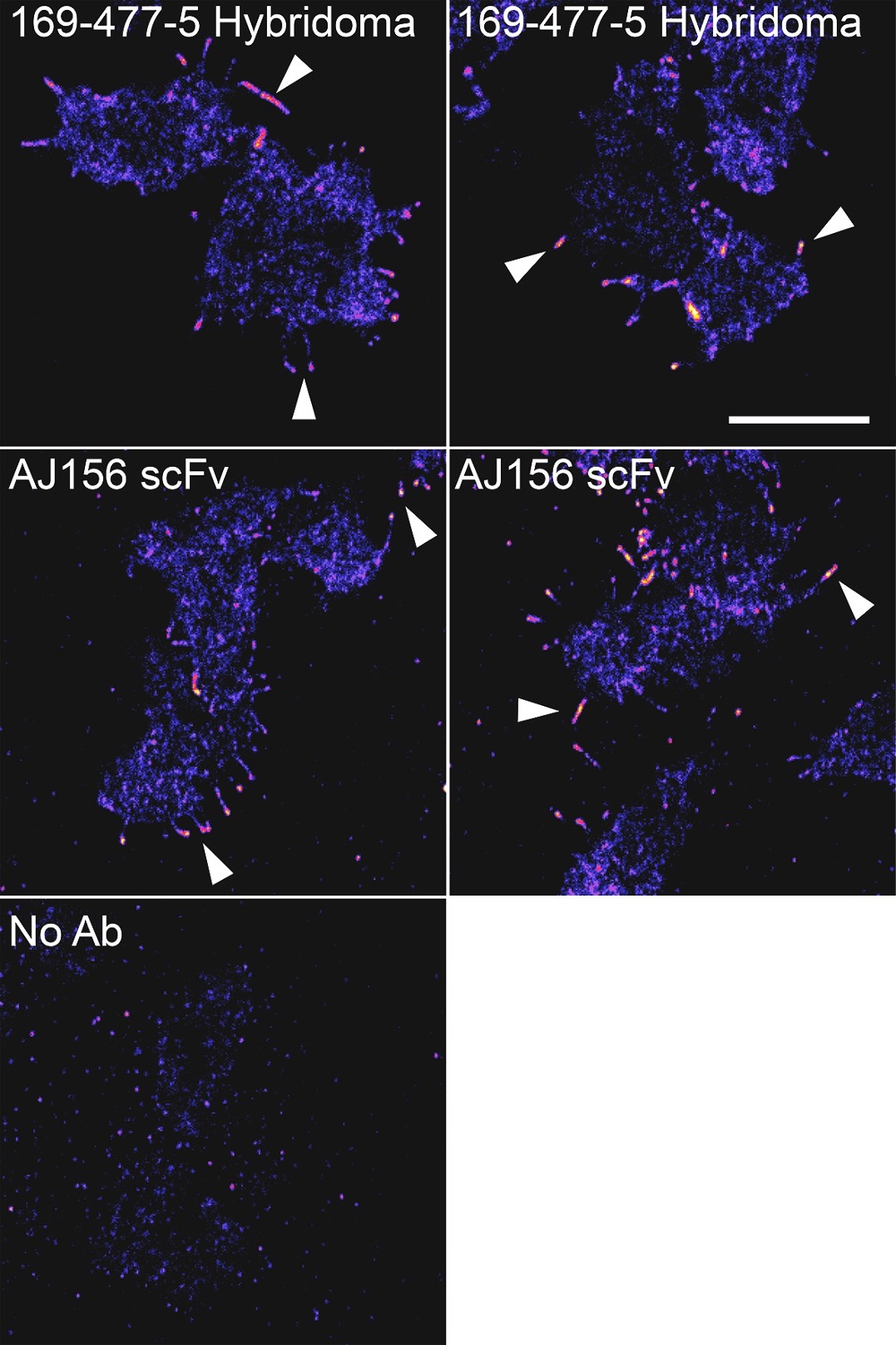 Figure 1. The 169-477-5 hybridoma and the AJ156 scFv antibody label the tips of filopods (some examples are indicated by arrowheads) in Dictyostelium cells. A faint cytosolic labelling is seen also when the primary antibody was omitted (No Ab). Scale bar: 10 µm.
