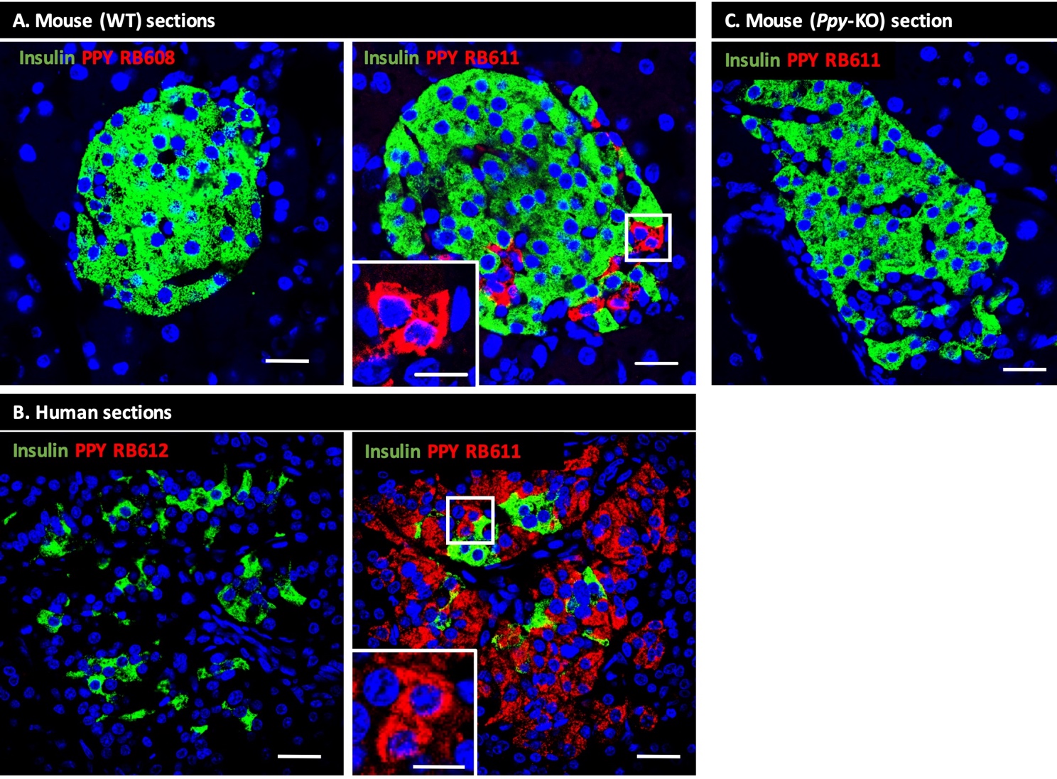 Figure 1. The anti-PPY RB611 antibody efficiently recognizes PPY hormone in mouse and human islets. (A) Immunofluorescence on pancreatic sections from 2-month-old wild-type (WT) mice (RB608 on the left and RB611 on the right). (B) Immunostaing of human islet cells (RB612 on the left and RB611 on the right). (C) Immunofluorescence on a pancreatic section from a 2-month-old Ppy knock-out mouse; no labeling detected with RB611. Scale bars: 20 μm or 10 μm (inset). Region of the pancreas: ventral, corresponding to the head of the pancreas.