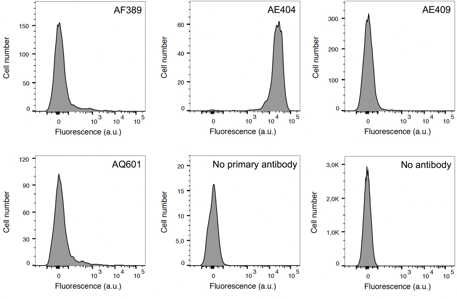 Figure 1. Live PAO1 P. aeruginosa are coated with AE404, as detected by flow cytometry. Graphs depict the Alexa Fluor 488 signal (Fluorescence axis) vs. the number of events (Cell number axis). AE404 bound specifically to PAO1 bacteria; AF389, AE409 and the negative control AQ601 did not. No labelling was seen when the primary antibody (No primary antibody) or the primary and secondary antibodies (No antibody) were omitted.