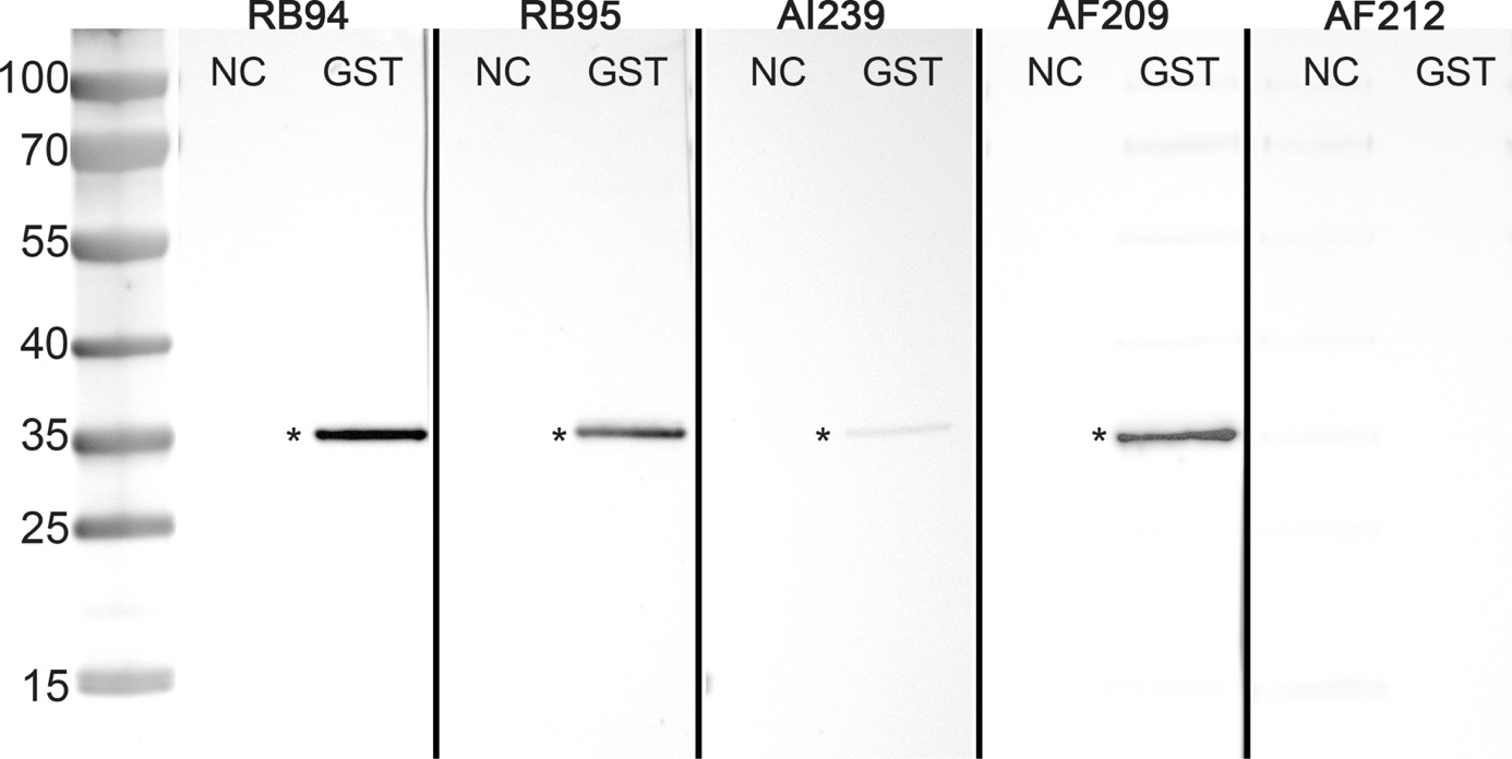 Figure 1. Specific binding of GST antibodies to the GST protein. GST was successfully detected by RB94, RB95, AI239 and AF209 (positions indicated by asterisks), but not by AF212. No band was observed in non-transfected E. coli bacteria (negative control, NC).