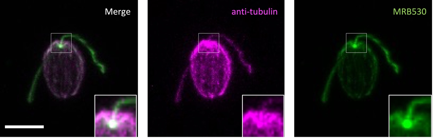 Protocol: U2OS cells were grown on 12 mm coverslips at 37 °C with 5% CO2 in DMEM supplemented with GlutaMAX (Life Technology), 10% tetracycline-negative fetal calf serum (Brunschwig), penicillin and streptomycin (100 µg/ml). Chlamydomonas reinhardtii cells were grown in liquid Tris-acetate-phosphate medium (TAP medium containing TRACE; Hutner et al., 1950) at 22 °C. Before fixation, Chlamydomonas reinhardtii cells were sedimented 30 min on 12 mm coverslips in a humid chamber. Cells on coverslips were fixed in cold methanol (-20 °C) for 7 min and blocked with PBS + 2% (w/v) BSA (PBS-BSA) for 15 min. Cells were then incubated for 1 hour with MRB530 diluted in PBS-BSA (1:250) and rabbit anti-beta tubulin (1:500, Abcam #Ab18251). Next, the coverslips were washed three times for 10 min in PBS-Tween 0.1% and incubated for 1 hour with secondary antibodies goat anti-mouse coupled to Alexa 488 (1:500, Invitrogen #A11029) and goat anti-rabbit coupled to Alexa 568 (1:500, Invitrogen #A11036). After 3 washes (10 min) with PBS-Tween 0.1%, coverslips were mounted in glycerol mounting medium containing DAPI (Abcam). Imaging was done on a Zeiss LSM780 microscope, using a 63x oil immersion objective.