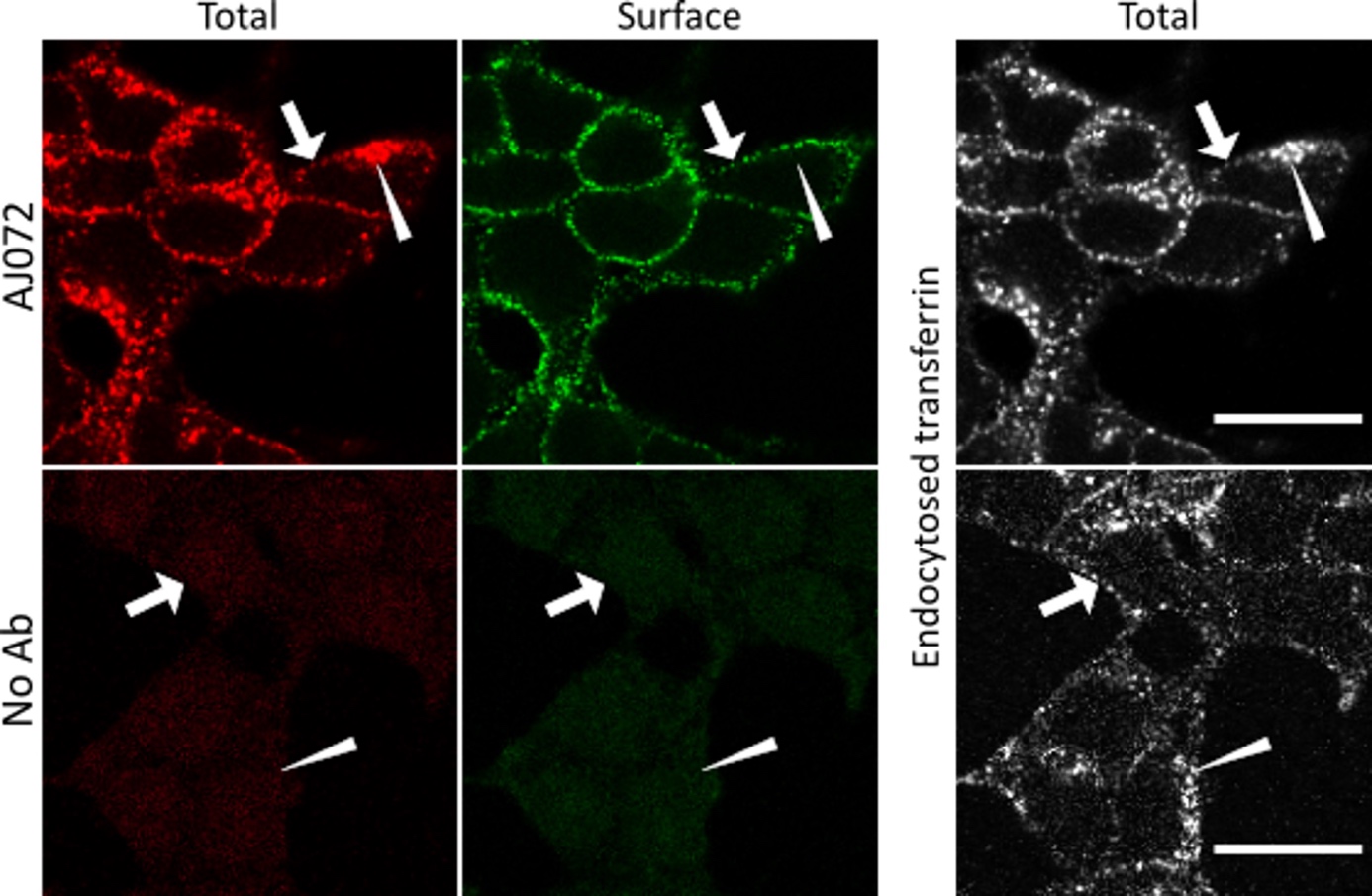 Figure 1. AJ072 successfully labeled the cell membrane (green channel, arrows) of HEK cells by surface immunofluorescence. AJ072 also successfully labeled the plasma membrane (arrows) and early endosomes (arrowheads) of HEK cells by total immunofluorescence. Early endosomes and cell surface were stained with surface-bound and endocytosed transferrin Alexa FluorTM-546 (in gray). The AJ072 intracellular labeling co-localized with the endocytosed transferrin (arrowheads). No labeling was observed when the primary antibody was omitted (No Ab panels). Scale bar: 20 µm.