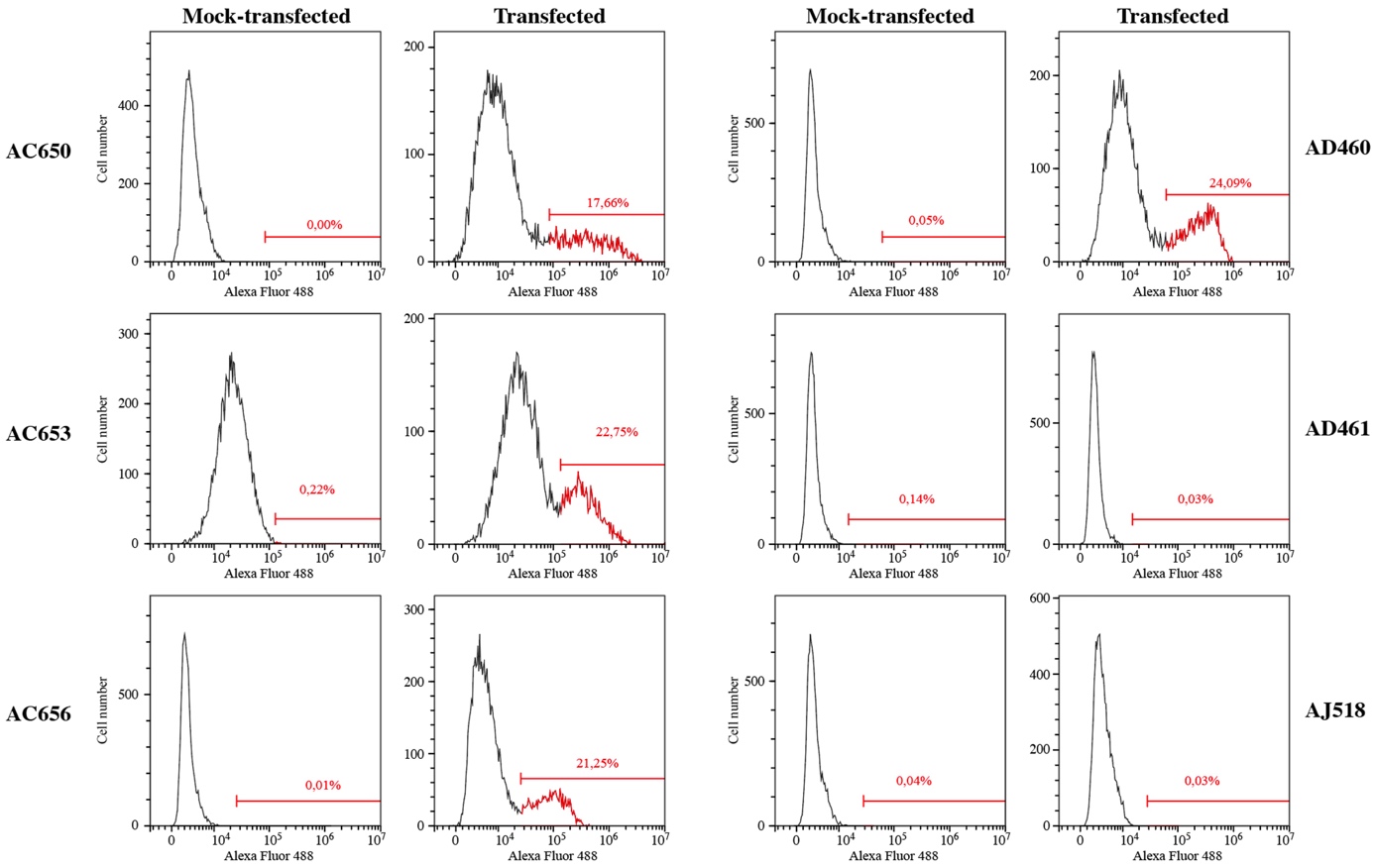 Figure 1. Mono-parametric representation of flow cytometry analysis depicting the Alexa Fluor 488 signal. AC650, AC653, AC656 and AD460 antibodies labeled HEK293 transfected cells overexpressing the CD8-alpha protein. No signal was detected in mock-transfected cells. AD461 and AJ518 did not recognize the CD8-alpha protein by flow cytometry. Transfection efficiency was estimated to be around 20%.