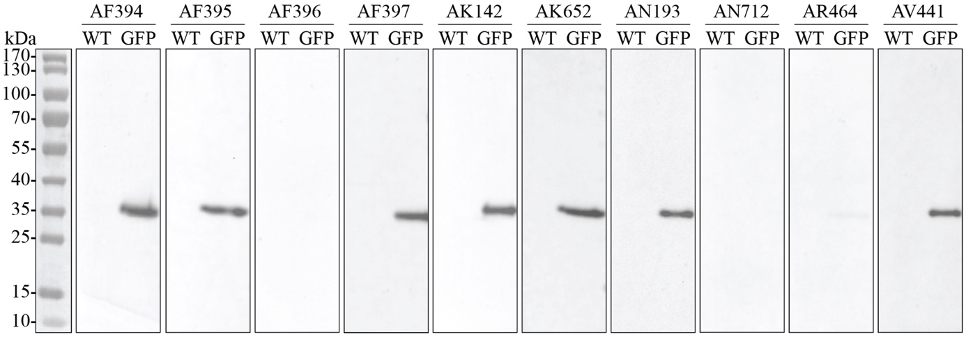 AF394, AF395, AF397, AK142, AK652, AN193 and AV441 antibodies label the GFP protein by western blot