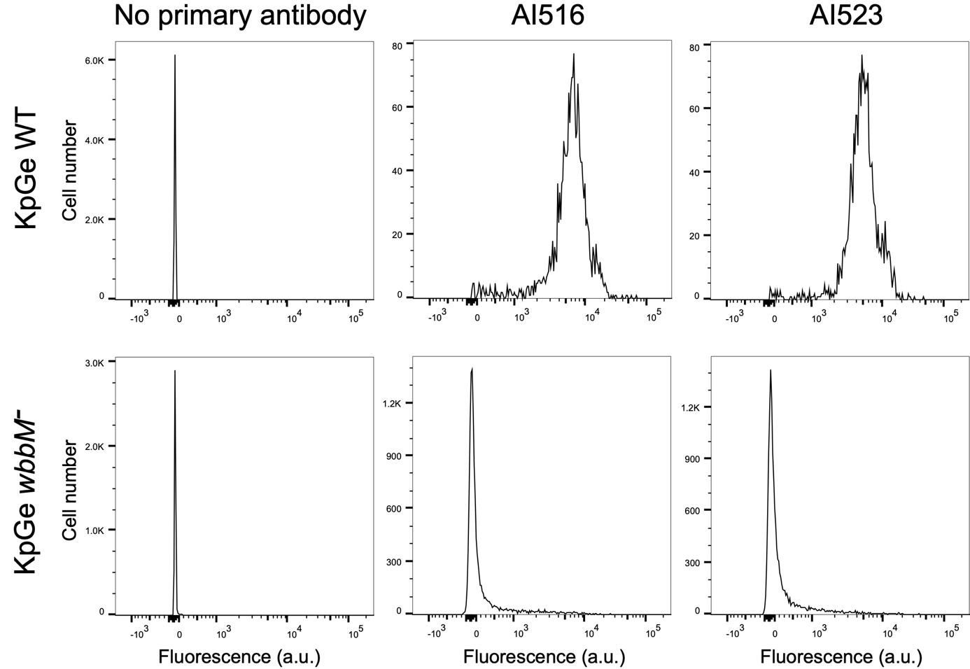 Figure 1. Live K. pneumoniae KpGe are coated with AI516 and AI523 antibodies, as detected by flow cytometry. Graphs depict the number of events (Cell number axis) vs. the Alexa Fluor 488 signal (Fluorescence axis). AI516 and AI523 antibodies bound specifically to KpGe WT strain, but not to the O-antigen deficient KpGe wbbM– strain. No labelling was seen when the primary antibody was omitted ("No primary antibody" panels).