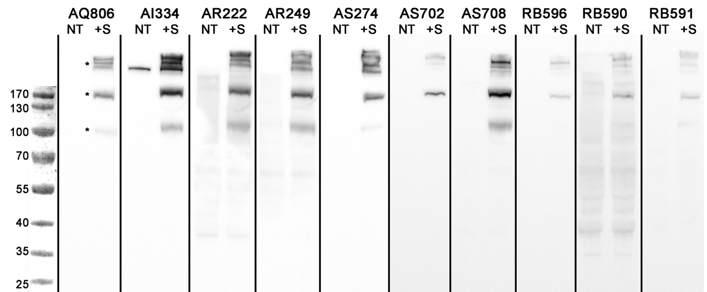 Figure 1. Antibodies AI334, AQ806, AR222, AR249, AS274, AS702, AS708, RB590, RB591 and RB596 specifically recognize the spike S protein from SARS-CoV-2 (the asterisks (*) denote the main forms of the protein: cleaved, full-length, and oligomerized; shown only for AQ806).