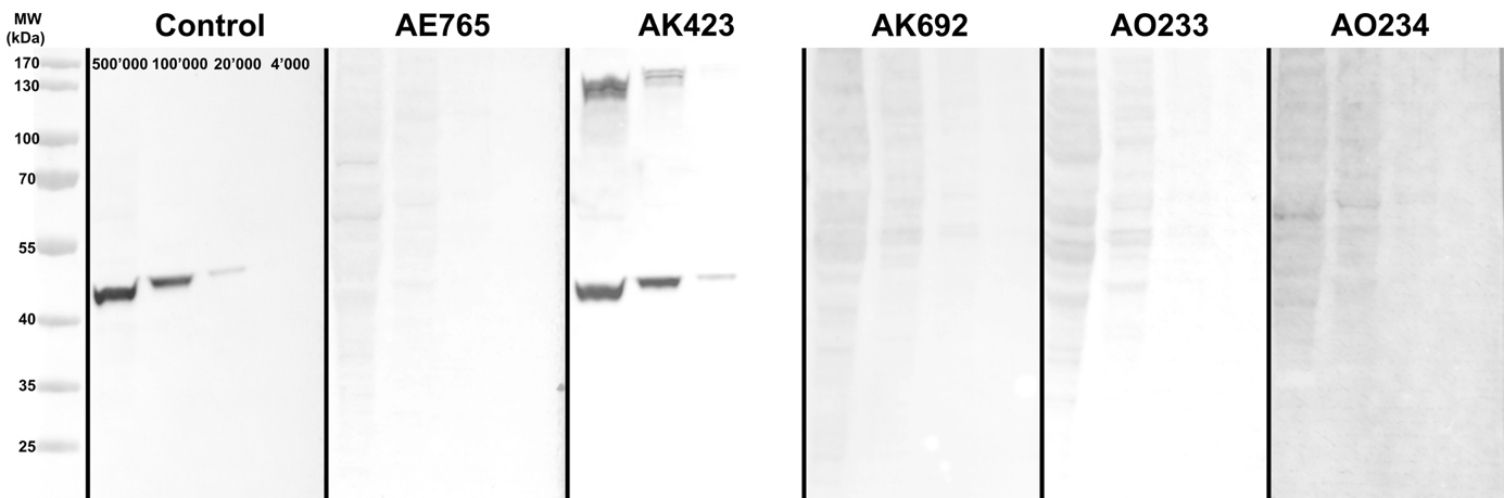 Figure 1. The AK423 antibody specifically recognizes the actin protein of HEK cells. The same detection pattern is seen for the positive control, a commercial anti-beta actin antibody. AE765, AK692, AO233 and AO234 antibodies do not detect any specific bands. For each antibody, four sample dilutions were used: 500’000, 100’000, 20’000 and 4’000 cells per well (labels shown only for the first antibody, “Control”).